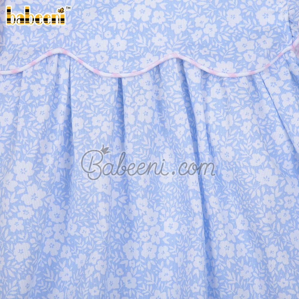 Features: Lovely baby dress for little girls with white floral printed on blue fabric, scallop on top, big bow on bottom, short sleeves. Perfect for Spring summer. Best gifts for birthday or special days.