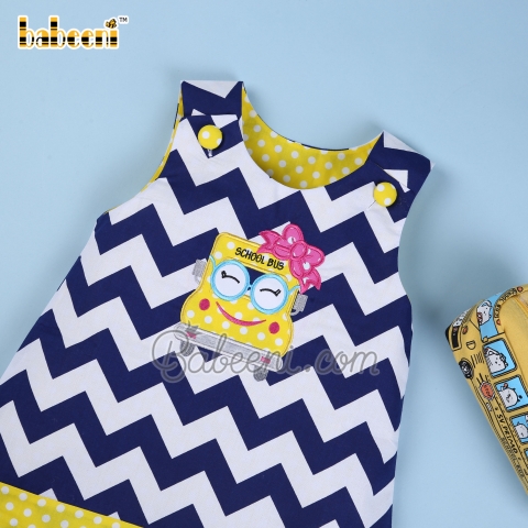 Feature: Lovely girl dress with School bus applique on the chest, buttons on the shoulder
