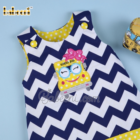 Feature: Lovely girl dress with School bus applique on the chest, buttons on the shoulder
