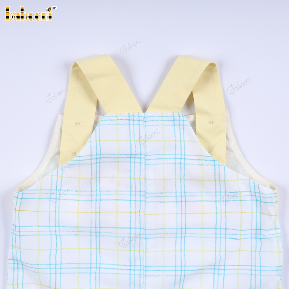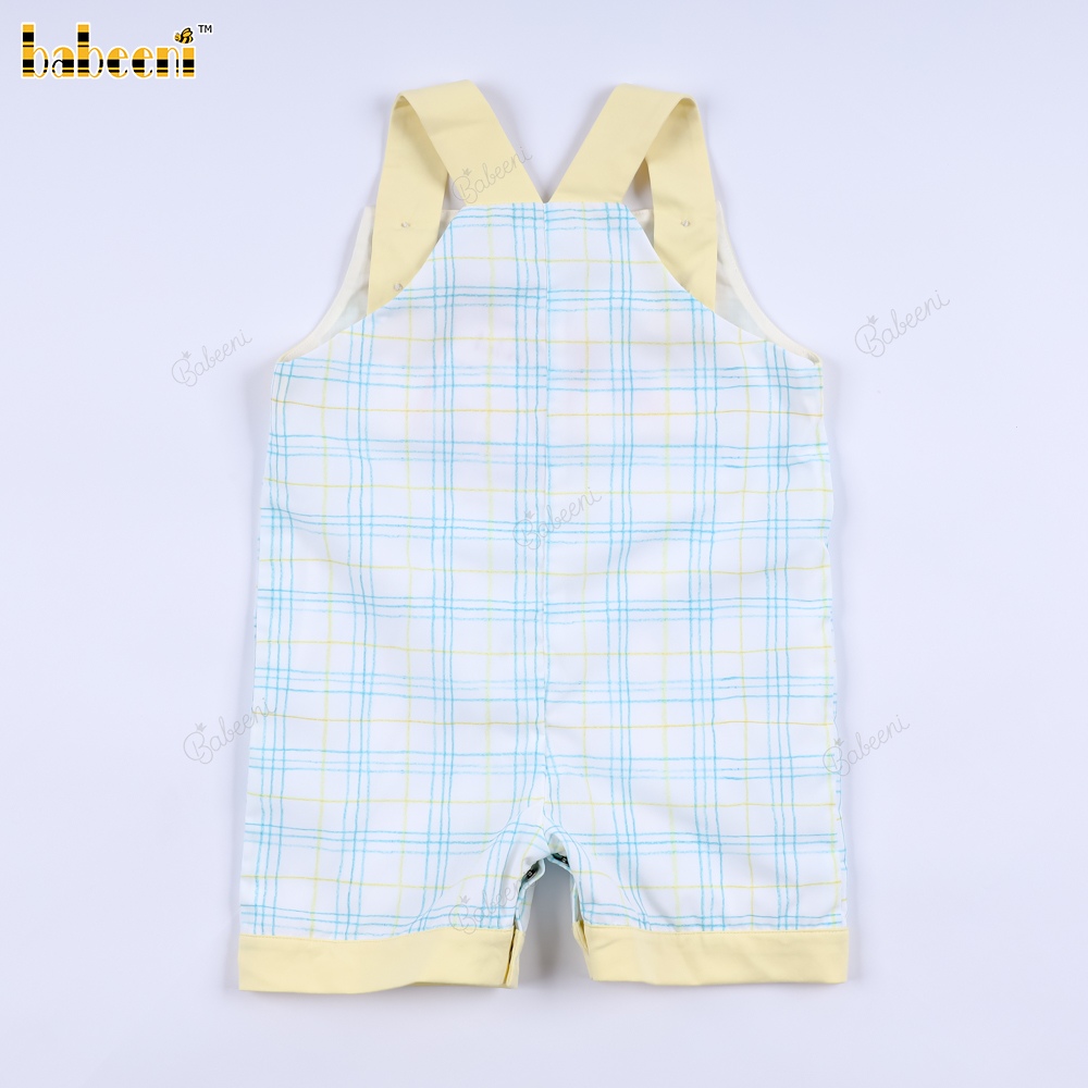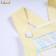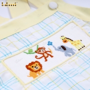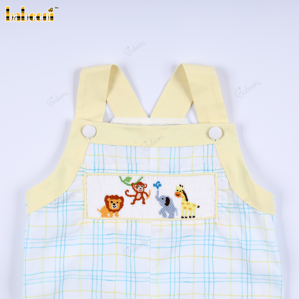 Features: Nice shortall for little boys with hand smocked lion, monkey, elephant & giraffe on the chest, covered buttons, yellow pipping. Perfect for Spring summer. Best gifts for birthday or special days.
