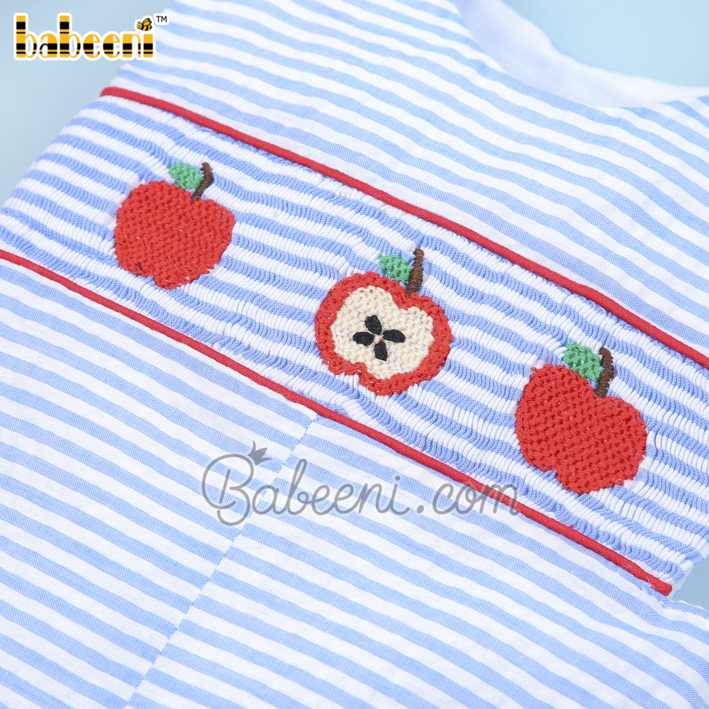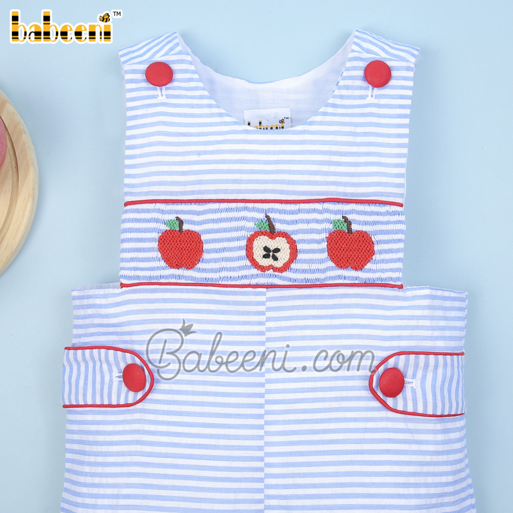 Feature: Cute smocked shortall for back to school occasion with apples smocked pattern on the bodice, side tabs, shoulder buttons, snap at crotch