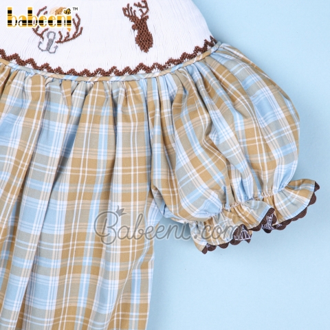Feature: Baby girls smocked bishop featured with cute reindeers and mallard smocked pattern around the neck. Back buttons for easy dressing, zigzag at hem