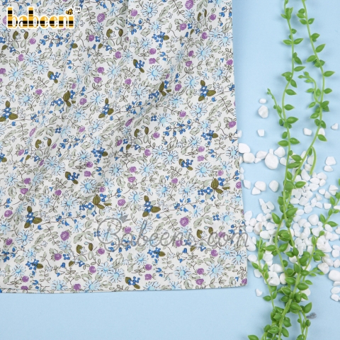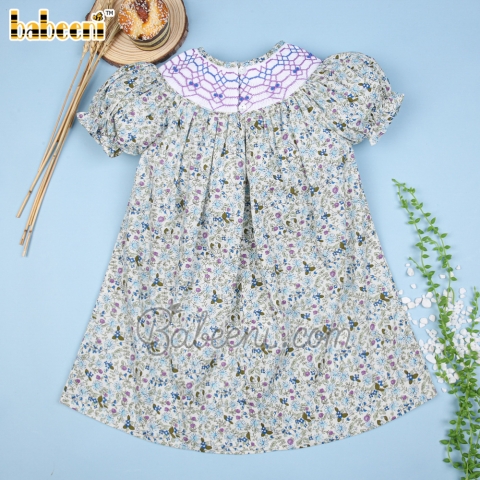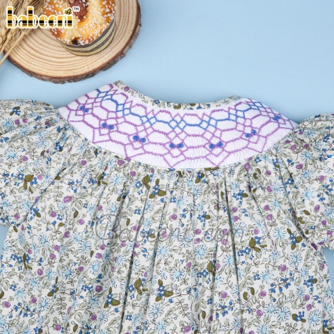 Feature: Beautiful girl smocked bishop flower dress with geometric hand smocked pattern and flower hand embroidery on the neck, short sleeves, back buttons.