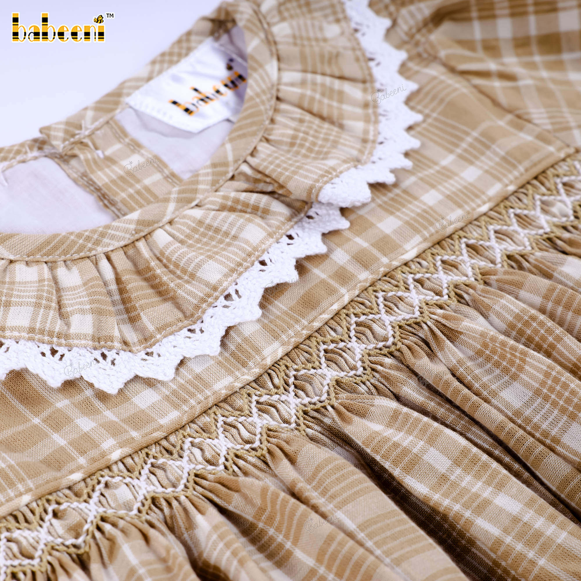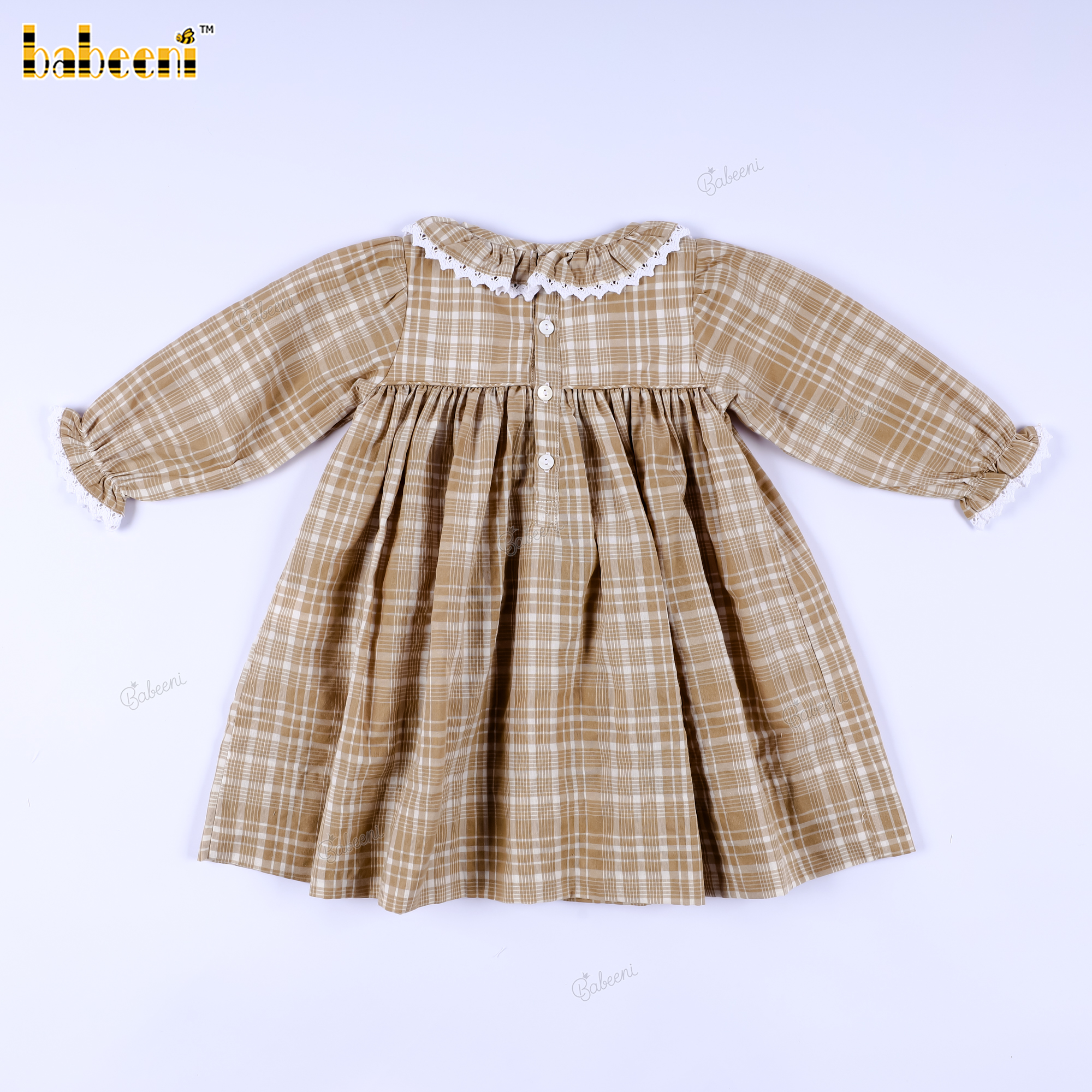 Beige Plaid Long-Sleeve Smocked Dress for Baby Girls- BB3590