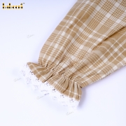 Feature: Elegant long-sleeve dress featuring a classic beige plaid pattern. The dress has a ruffled collar with delicate lace trim and smocked detailing across the chest for a charming, vintage-inspired look. Full skirt design allows ease of movement, and elasticized cuffs add comfort. Perfect for special occasions, family gatherings, or photoshoots.