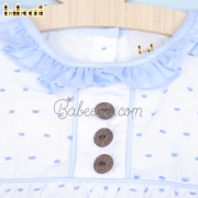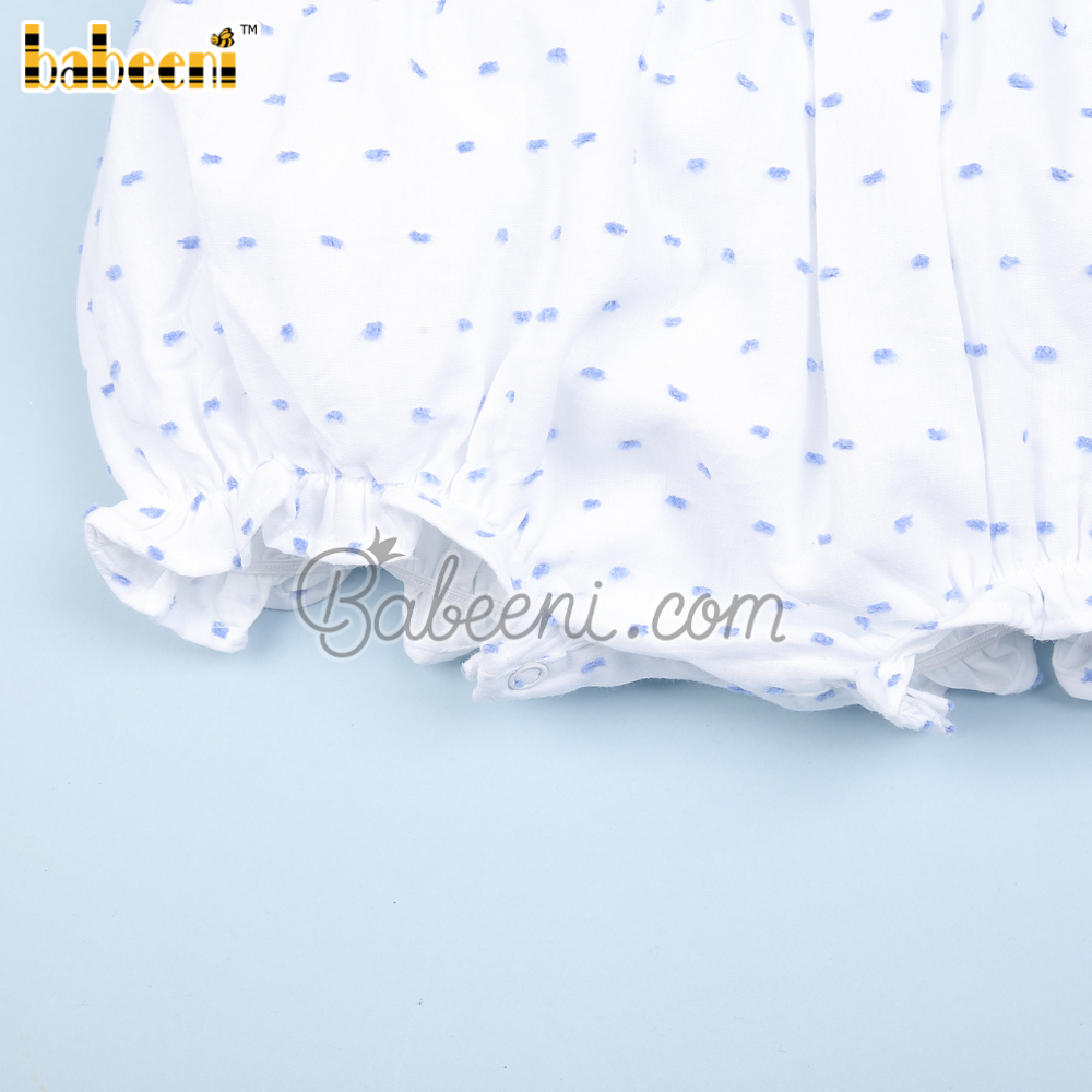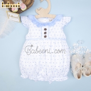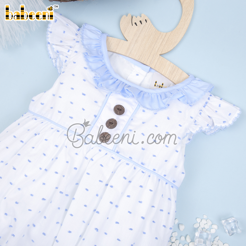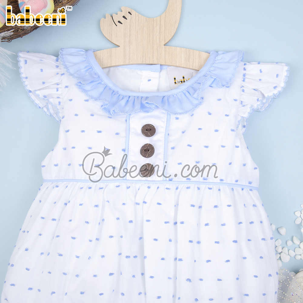 Feature: Cute bubble for baby girl. The bubble has round neck with ruffle, angle-sleeves and back buttons. More outstanding with wooden button on the front and crotch snaps for easy dressing. Best gifts for birthday or special occasions.