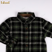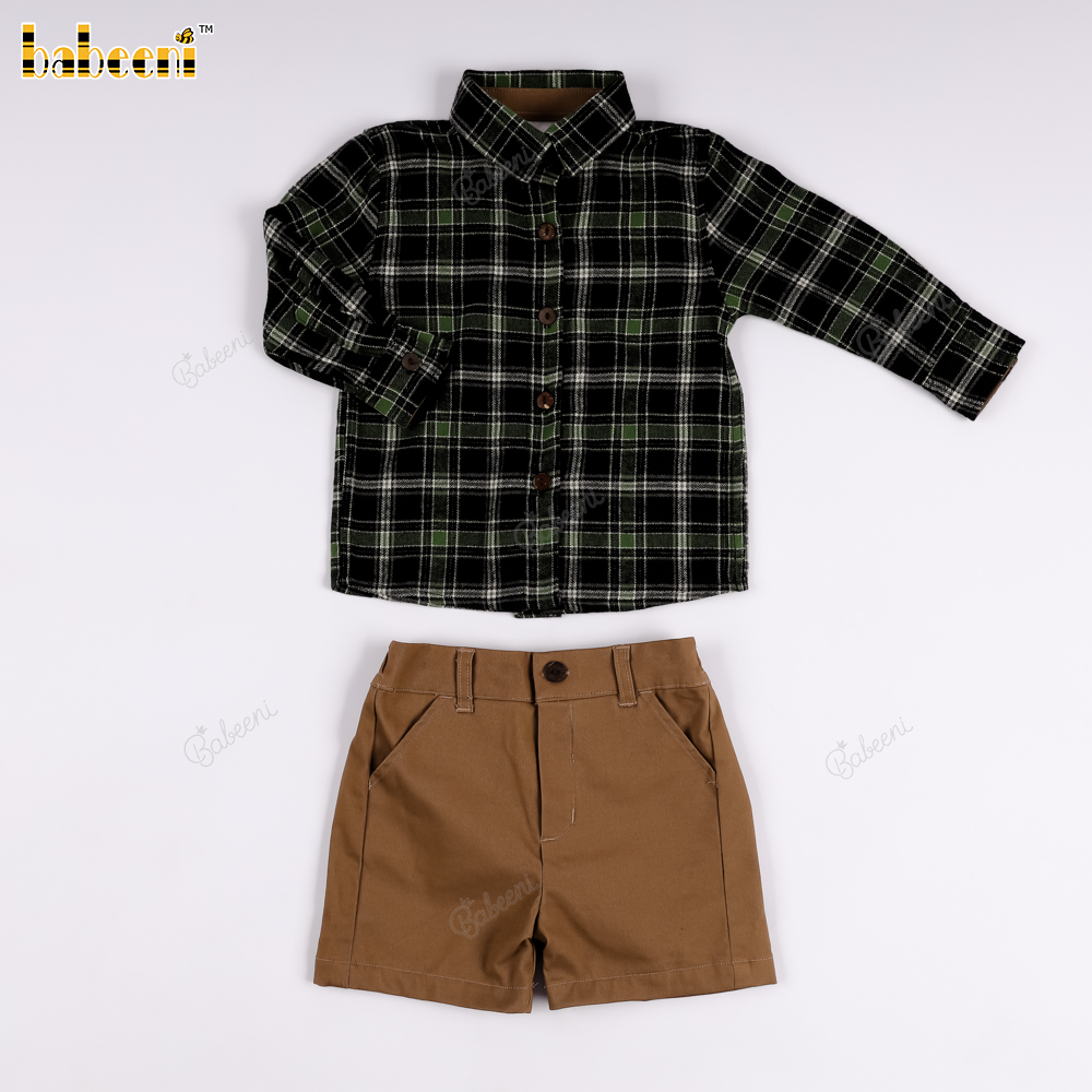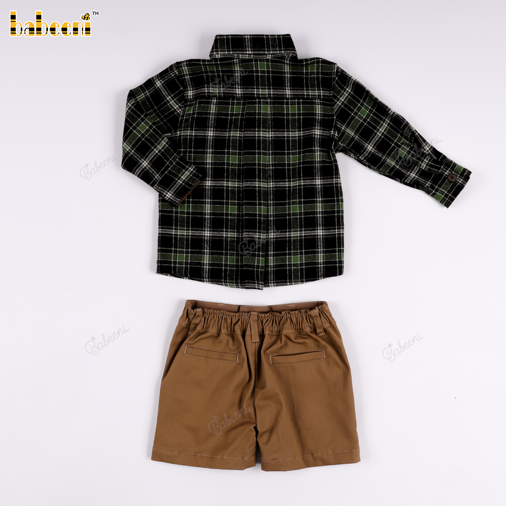 Boys' checkered flannel shirt in blue and black, and brown khaki shorts set.- BB3561