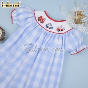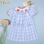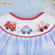 Features: Lovely dress for little girls with hand smocked fire truck, police car & ambulance on the neck, short sleeves with red zigzag. Perfect for Spring summer. Best gifts for birthday or special days.