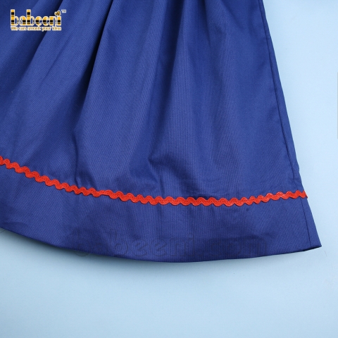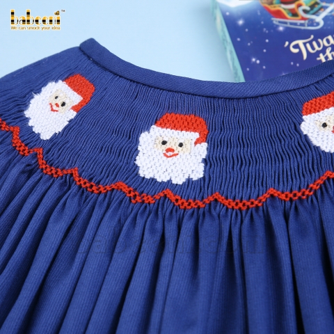 Feature:Pretty Christmas smocked dress in bishop style with Santa Claus hand smocked patterns around the neck, puff sleeves, back buttons.