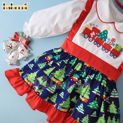Feature: Beautiful girl set with Christmas train on the chest, sleeveless, embellished with lovely ruffle along both sides of dress & hem. Combining with white T-shirt is perfect.