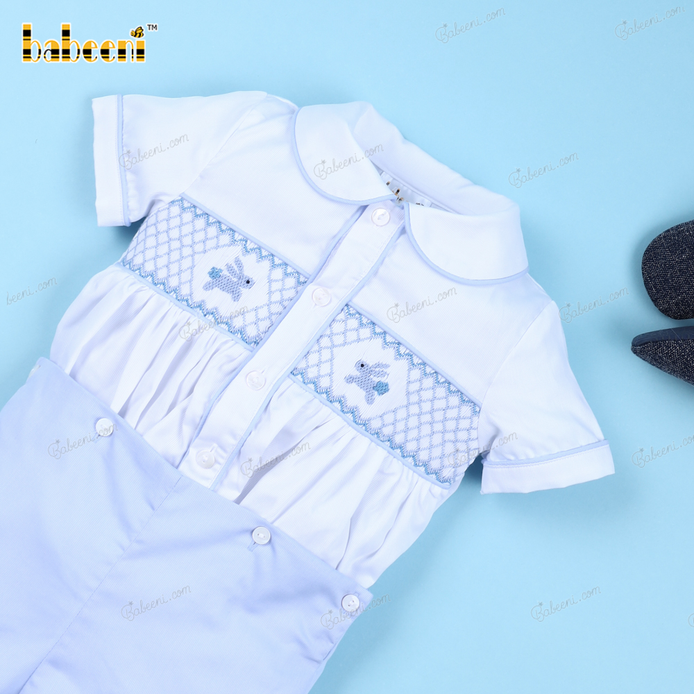 Features: Nice clothing set for little boys with geometric hand smocked on the chest, buttons at back, short sleeves. Best gifts for birthday or special days.