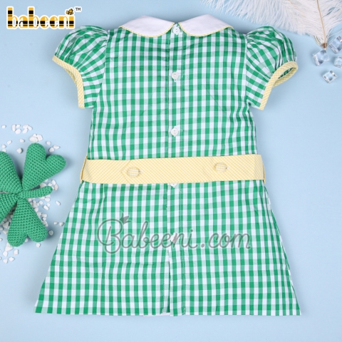 Feature: Girl dress for St. Patrick with clovers hand-embroidered pattern in the front, belt with buttons