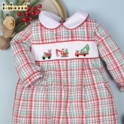 Features: Lovely smocked bubble for little boys with hand smocked construction truck on the chest, white collar, red hem. Perfect for fall winter. Best gifts for birthday or special days.