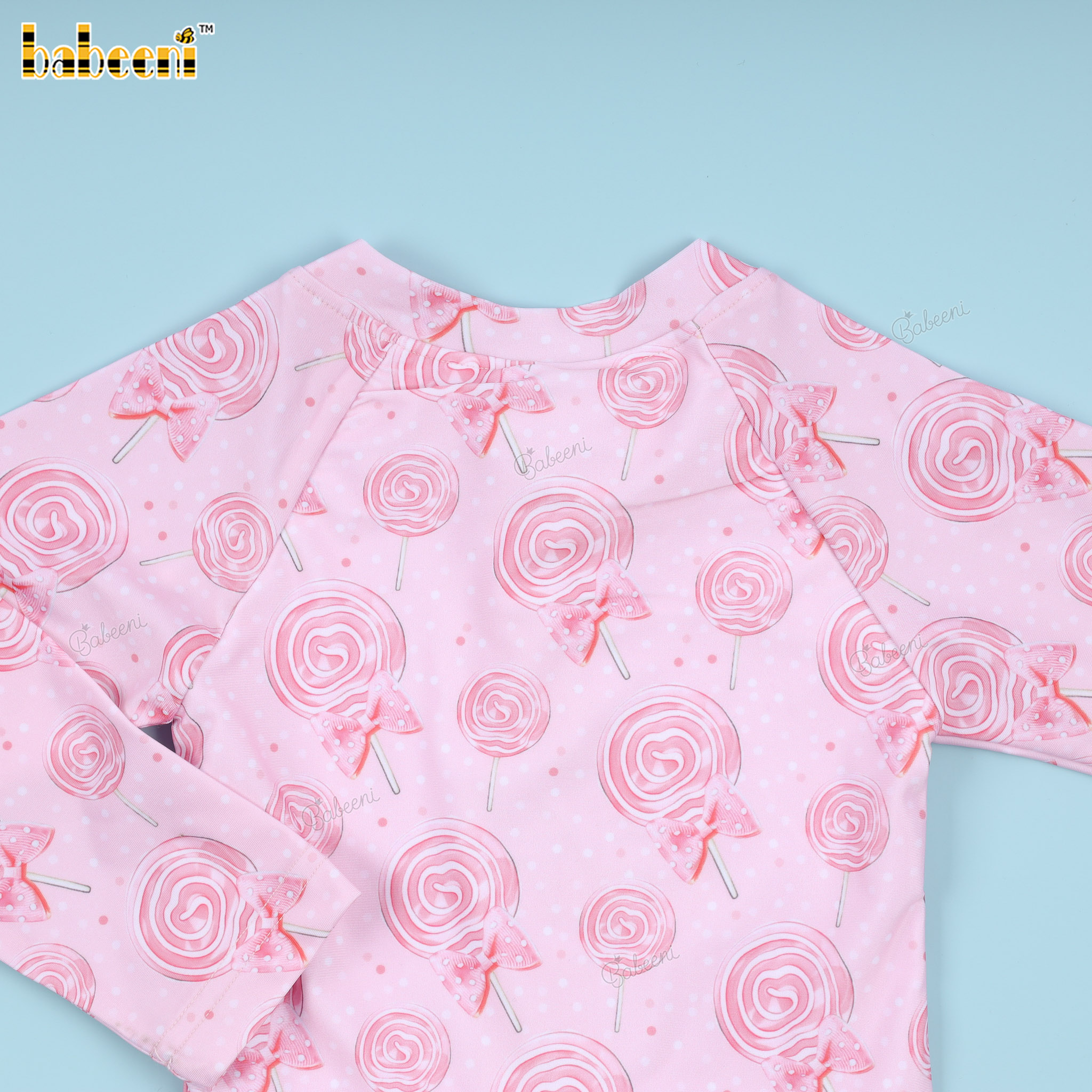 Features: Fancy Pink swimwear for little girls with sweet candy pattern printed by digital printed 4.0 technology. Perfect for Spring summer. Best gifts for birthdays or special days.