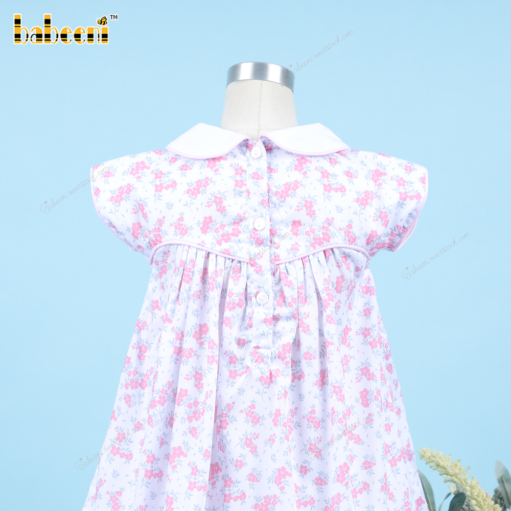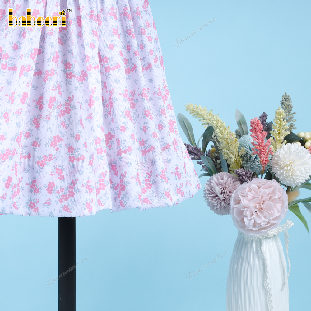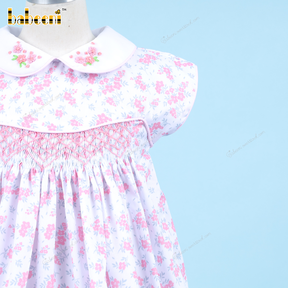 Geometric Smocked Dress With Pink Hand Embroidery Flowers For Girl - BB3305A