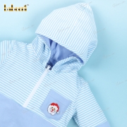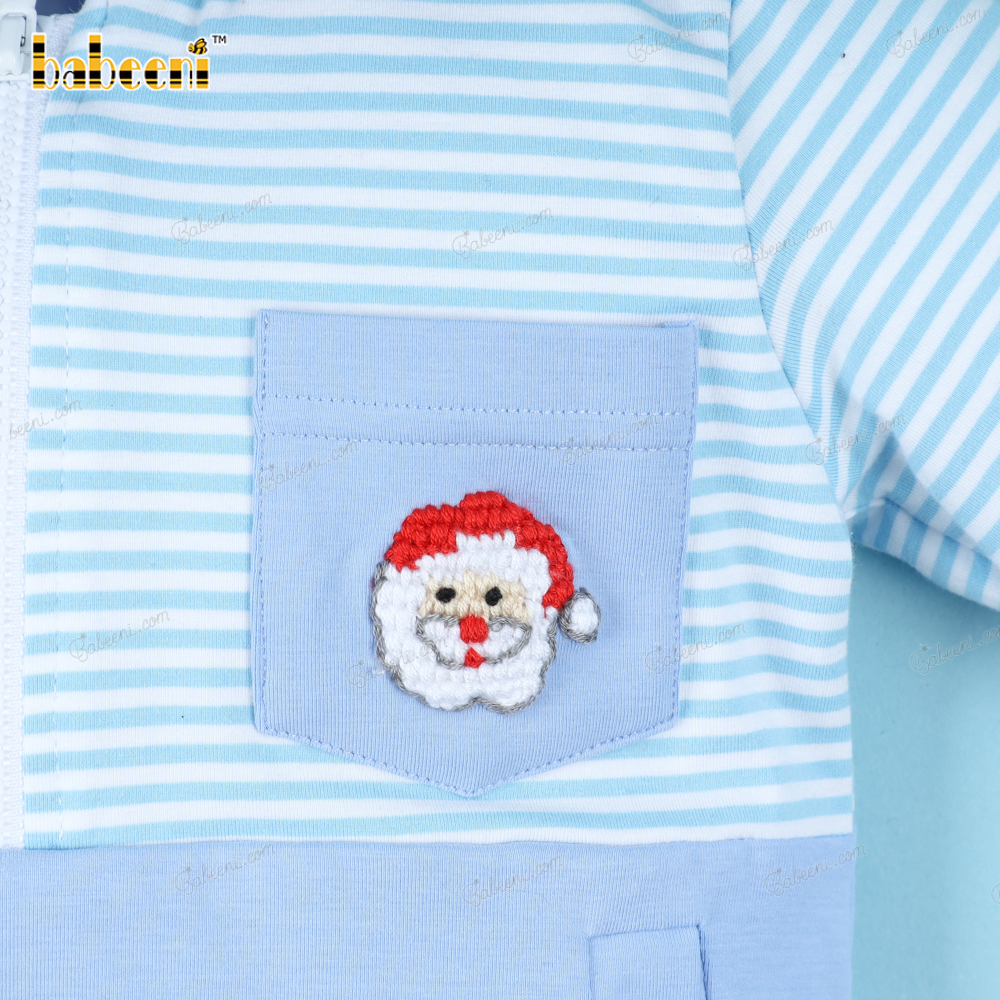 Feature: This hoodie is made out of knit fabric both safety for children. Blue horizontal stripes and blue sleeves with a tiny Santa image French knot on the right chest.