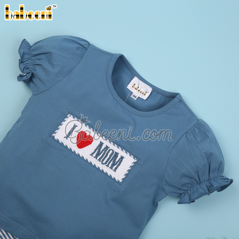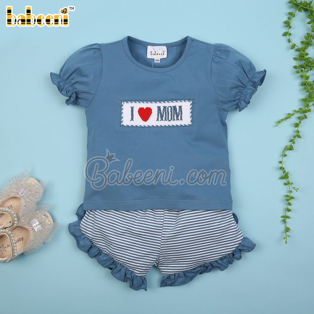 Features: Lovely set clothing for little girls with hand smocked I love Mom on the chest, ruffle on bottom, angel sleeves. Perfect for Spring summer. Best gifts for birthday or special days.