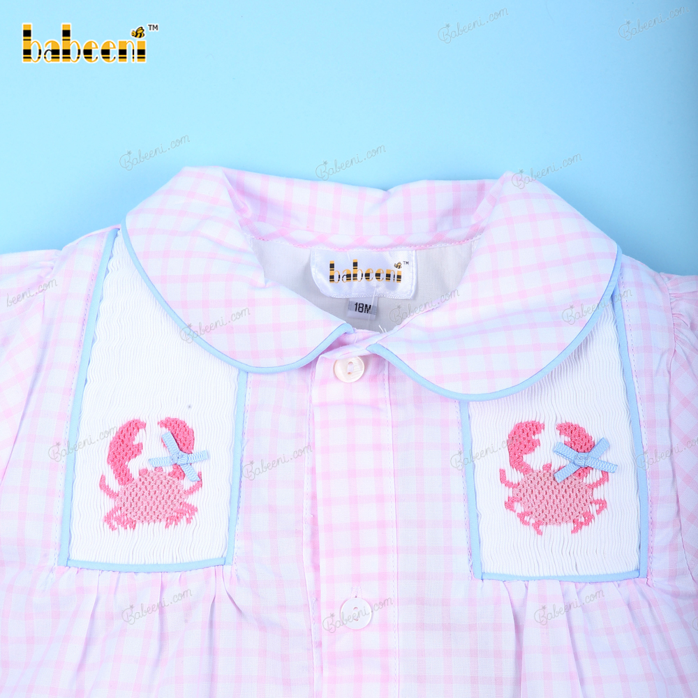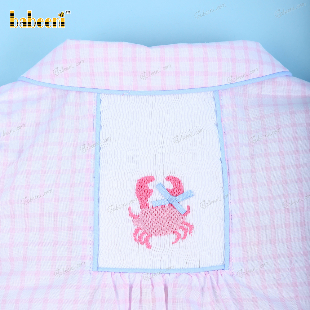 Feature: Beautiful baby bubble with crab hand-smocked patterns, short sleeves SS 2023 for girl collection. Perfect for summer and spring days.
