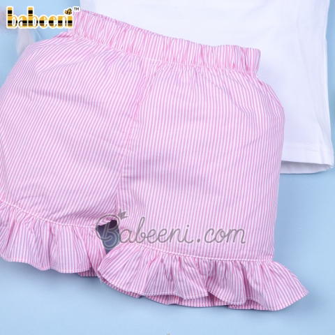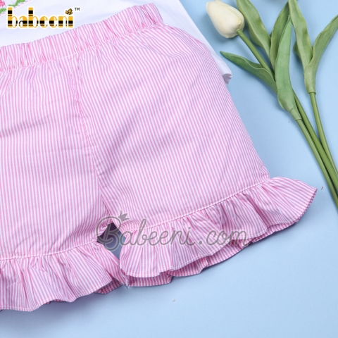 Feature: Lovely girl smocked short set with bunny & eggs basket smocked pattern on chest, round neck, angel sleeves, ruffle shorts