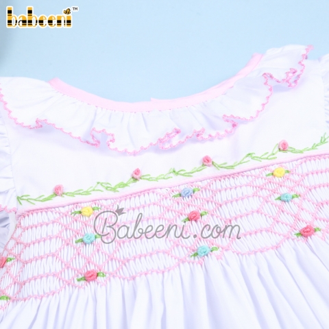 Feature: Cute smocked dress for little girls with geometric hand-smocked patterns on the bodice, angel sleeves, ruffle at collar