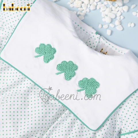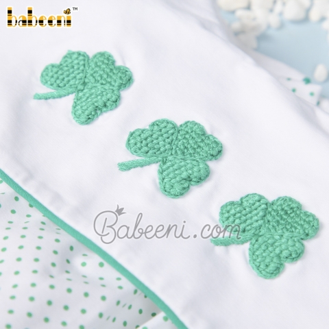 Features: Nice baby bubble for little boys with hand crochet of lucky leaves on the chest, green hem. Best gifts for birthday or special days.