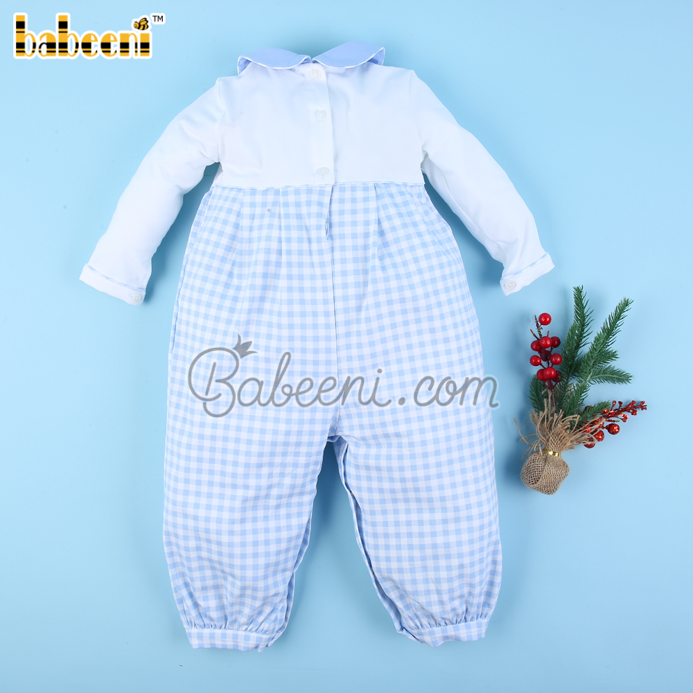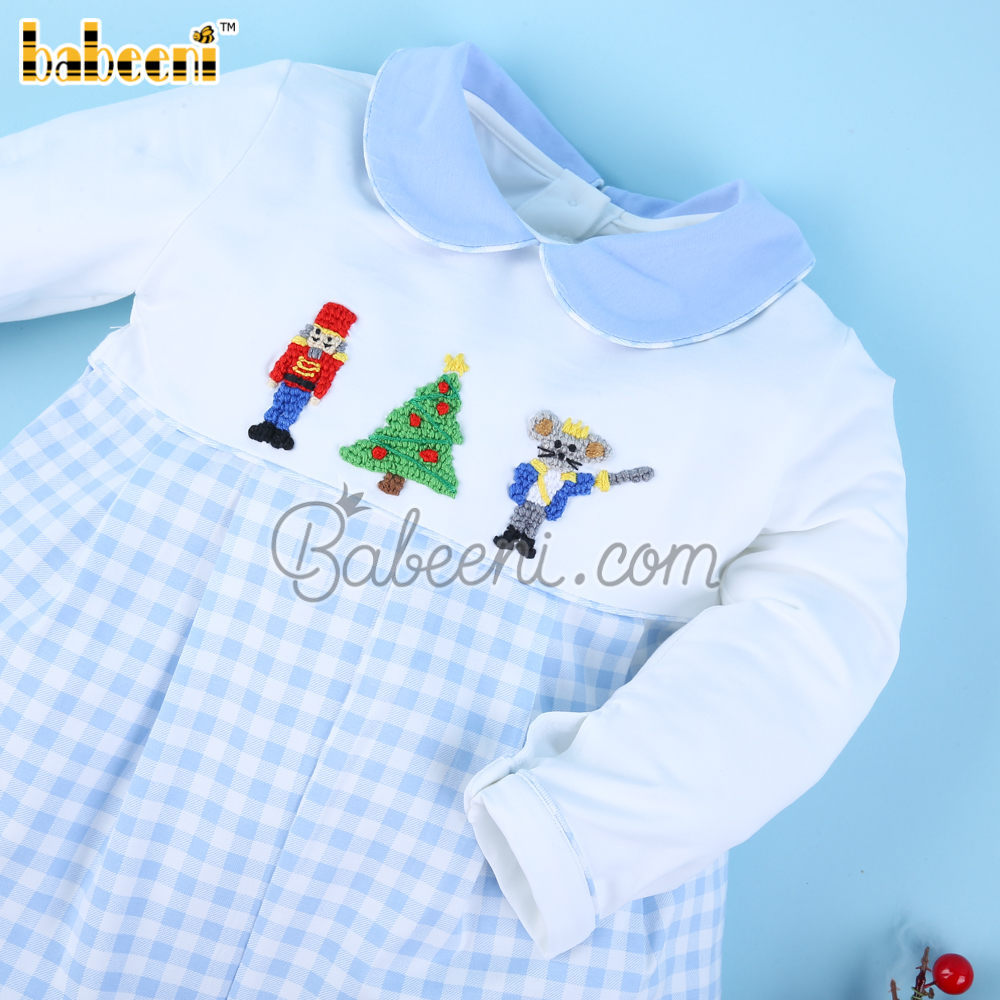 Features: White and baby blue gingham boy bubble, hand crochet Christmas characters, Peter pan collar, gingham hemline, long sleeves. Perfect for Chrismast. Best gifts for birthdays or special days.