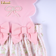 Feature: Adorable one-piece romper featuring a soft pink bodice with scalloped shoulder details and a delicate pearl bow embellishment on the chest. The bottom half showcases a floral striped bubble design with three matching pink bows at the waist. Elasticized leg openings provide comfort and easy movement for your little one. Perfect for casual outings or special occasions.