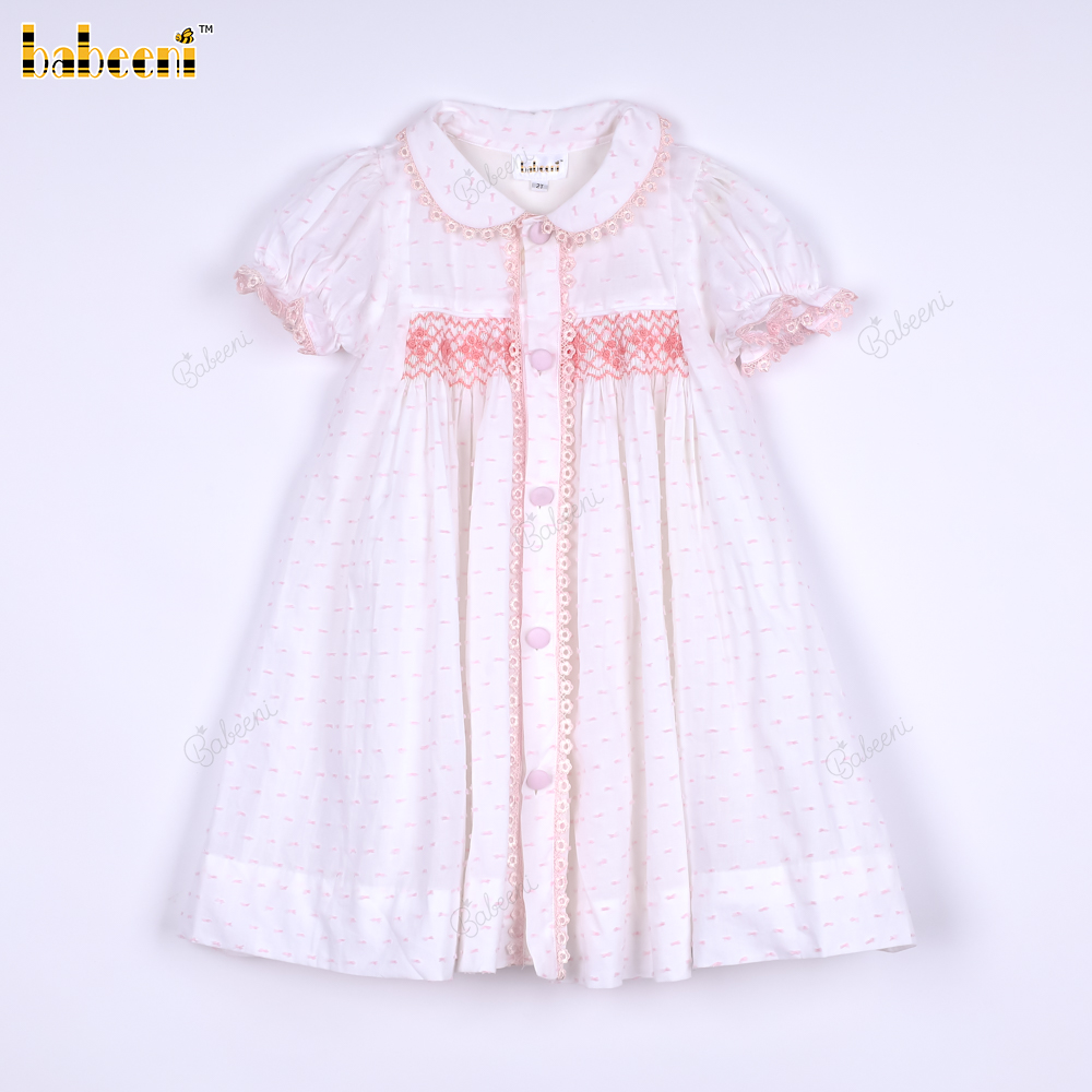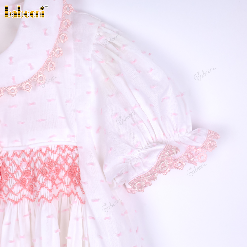 Features: White with pink swiss dot dress, hand smocked in pink and flower dotted, pink lace, covered buttons. Perfect for Spring summer. Best gifts for birthday or special days.