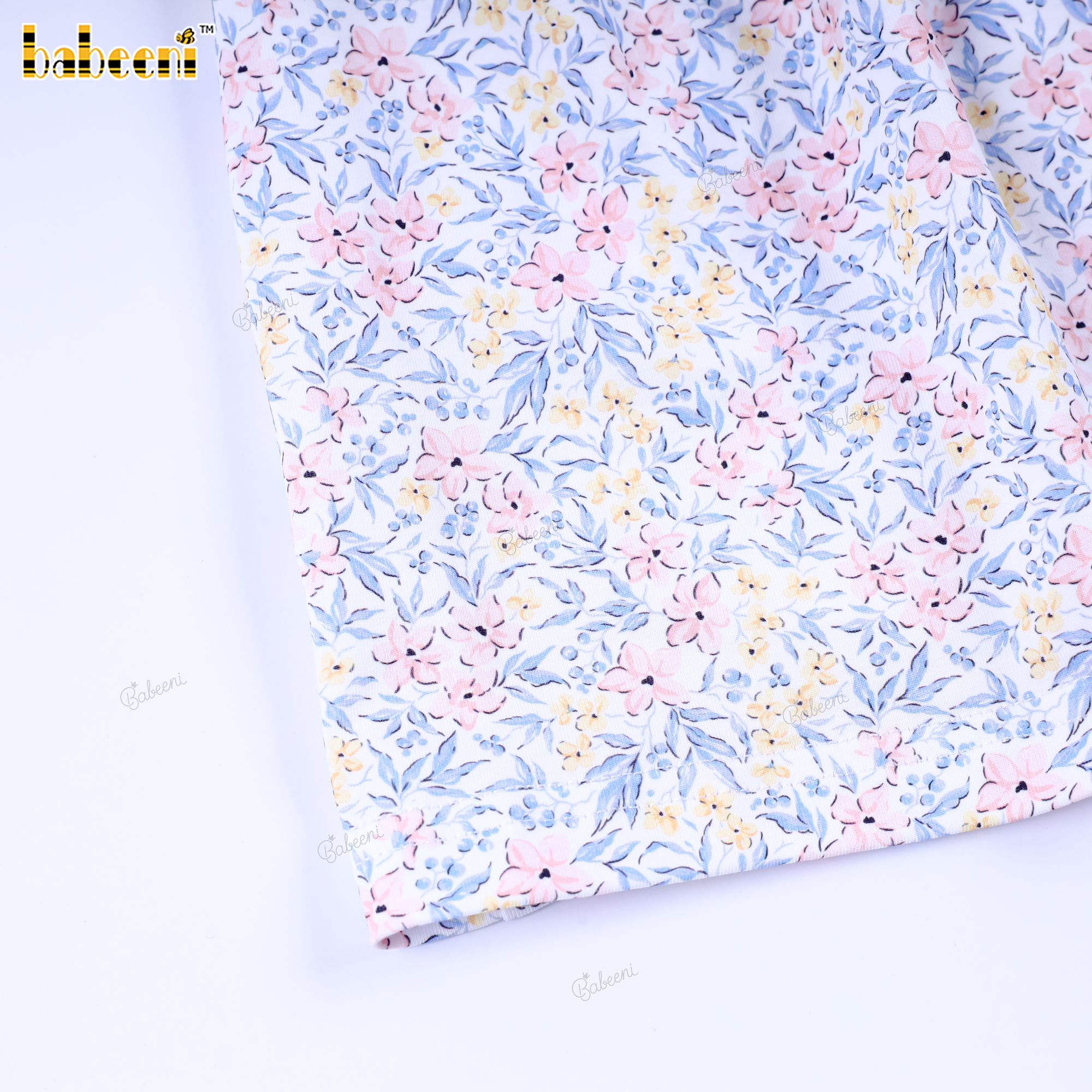 Material: Lightweight fabric printed with small pastel floral patterns, combined with hand-smocked detailing