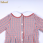 Features: Red and navy windowpane bubble for little boy with a rectangle hand smocked, long sleeves, peter pan collar. Perfect for Fall- Winter, Christmas. Best gifts for birthday or special days.