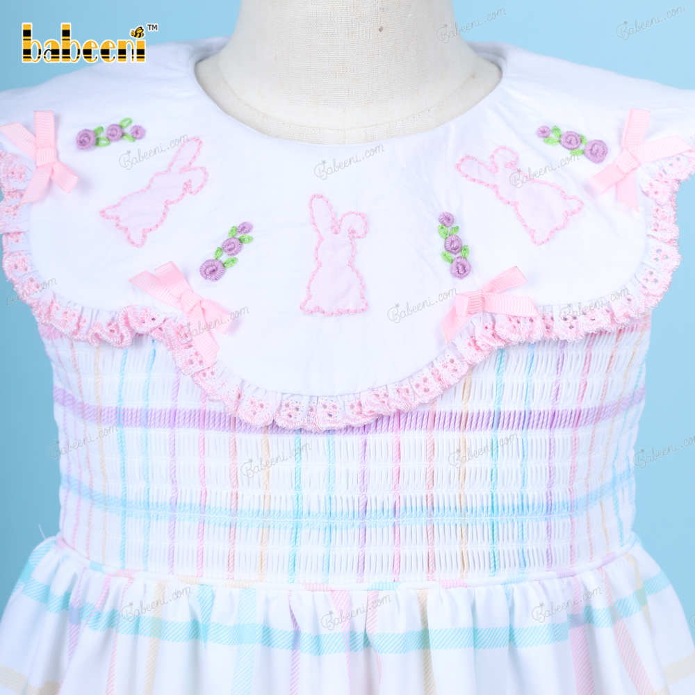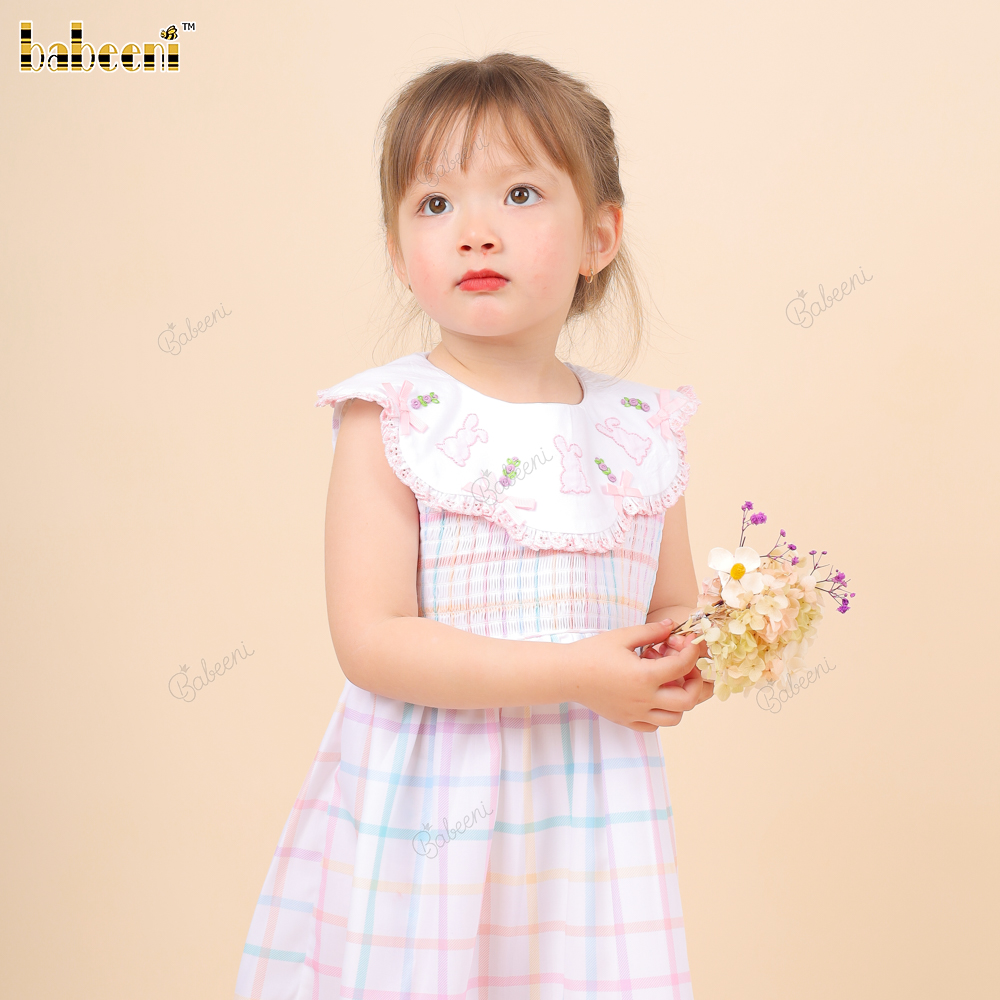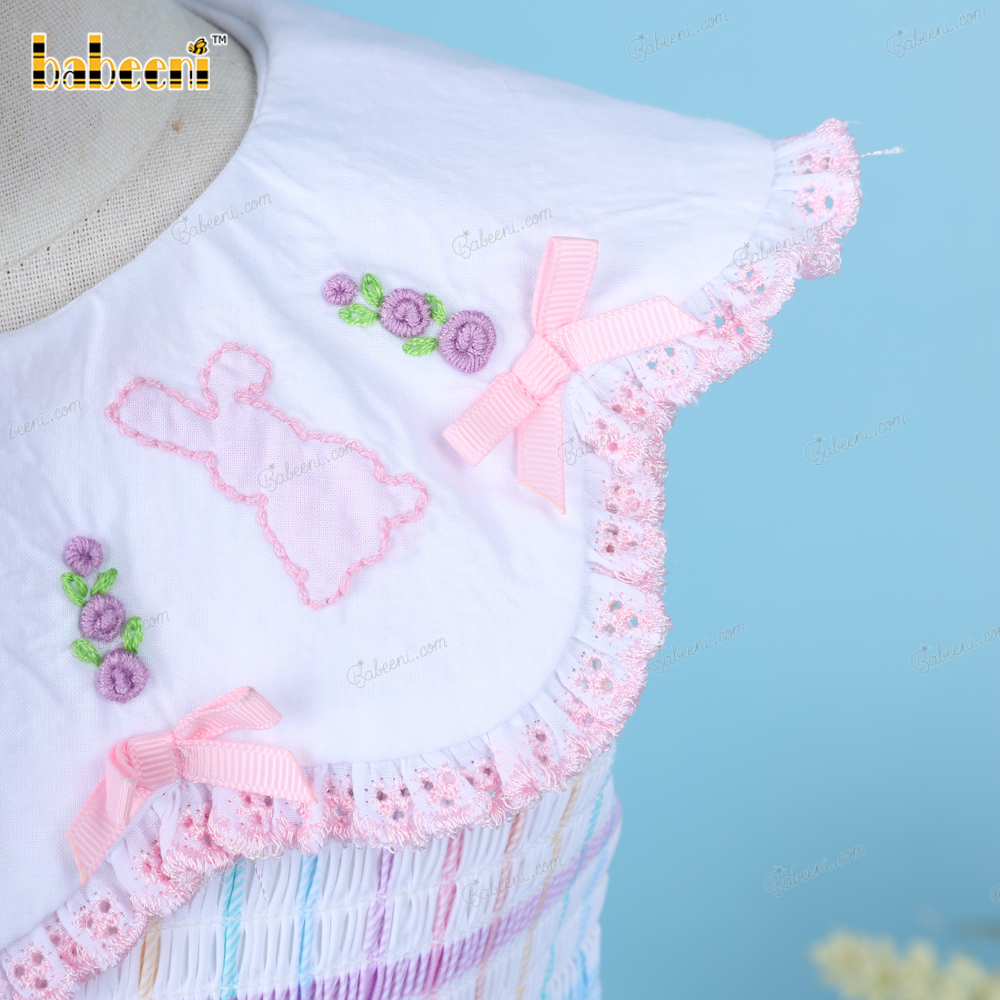 Shirred Dress Hand Embroidery Bunny Pink For Girl - BB3248A