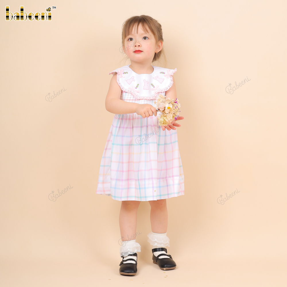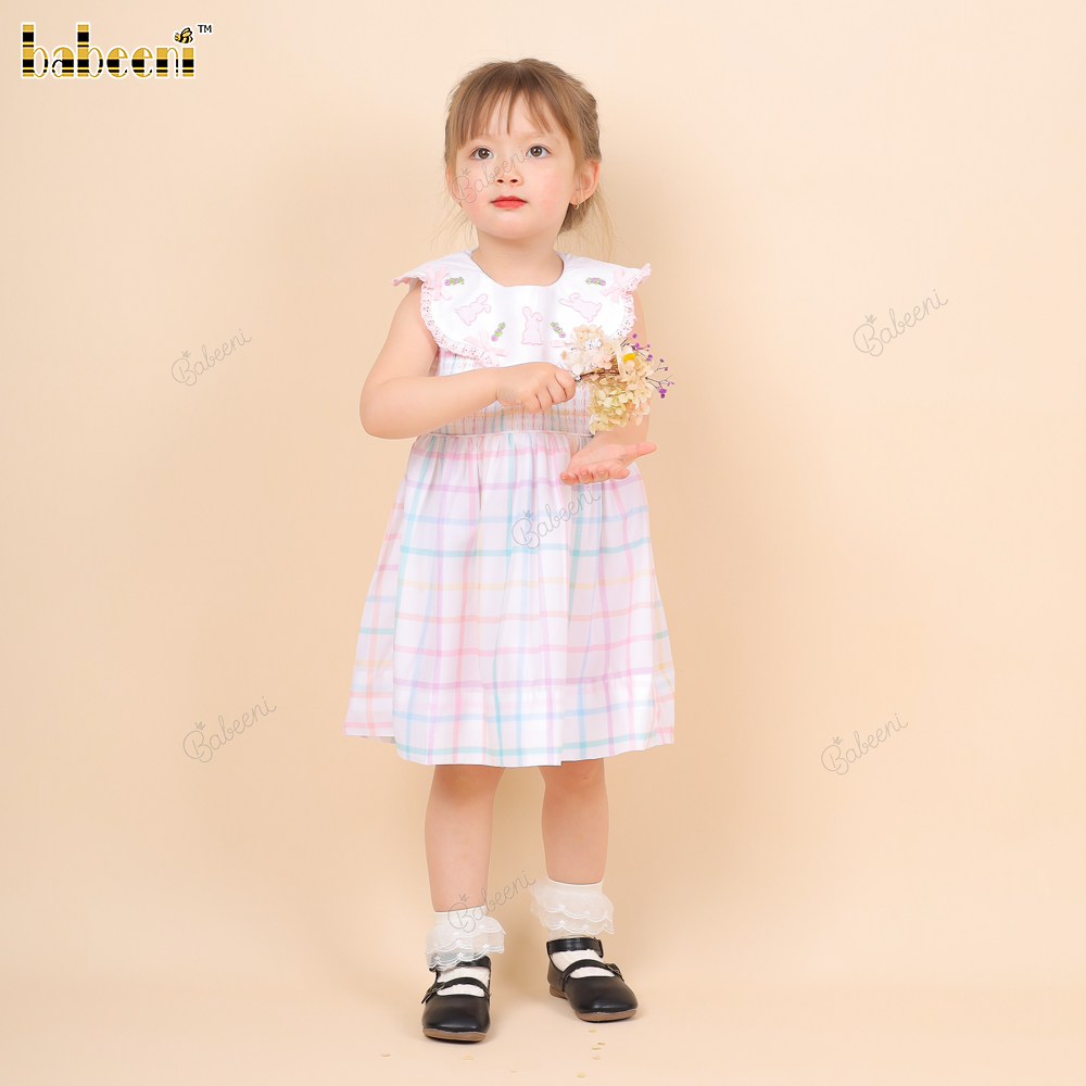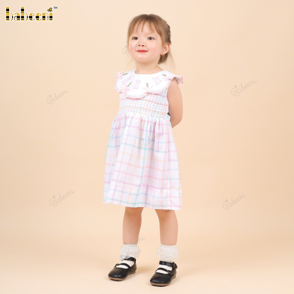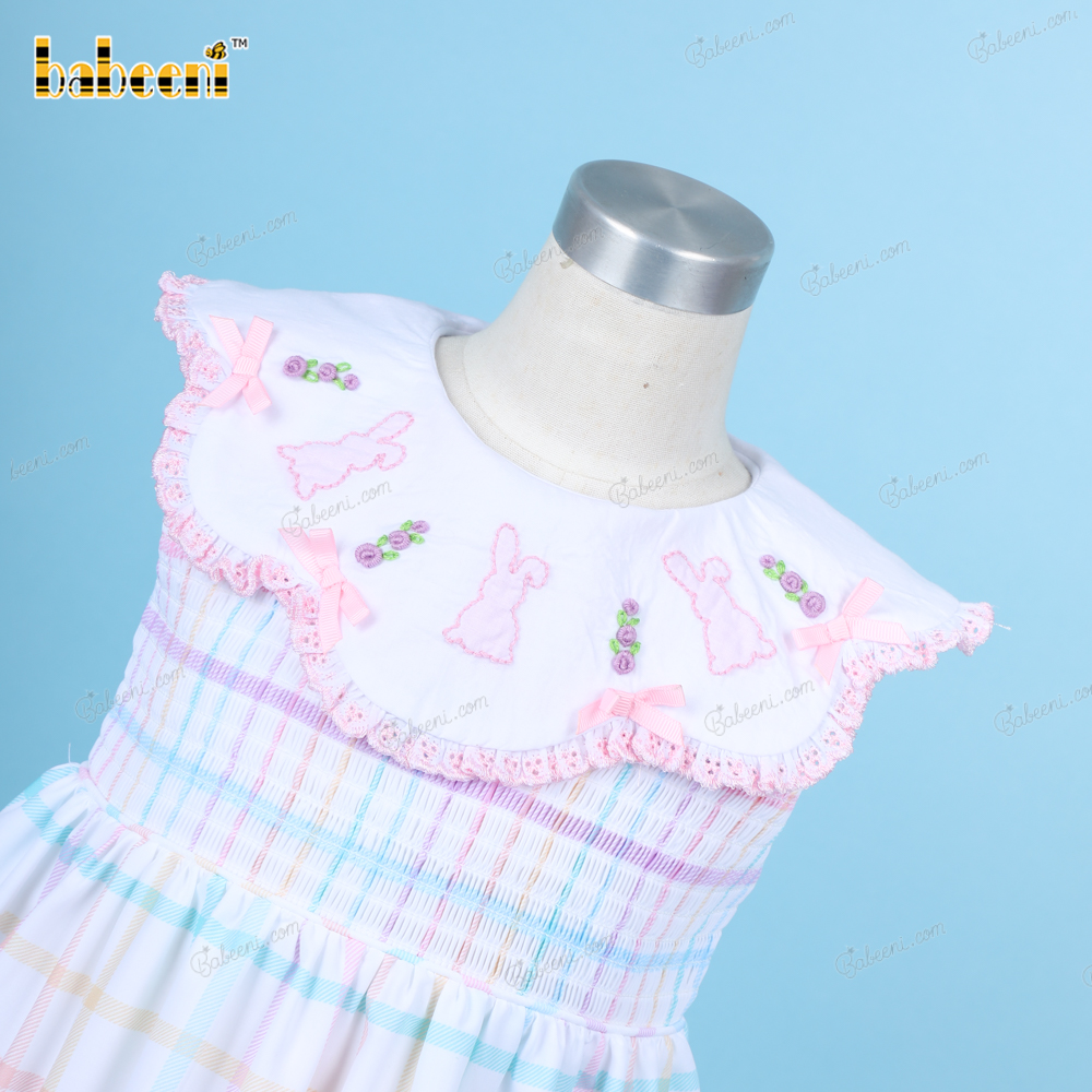 Shirred Dress Hand Embroidery Bunny Pink For Girl - BB3248A
