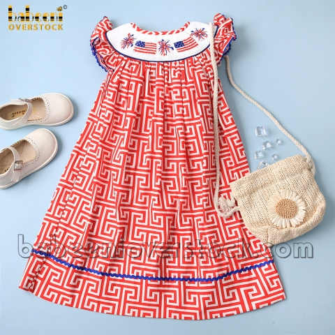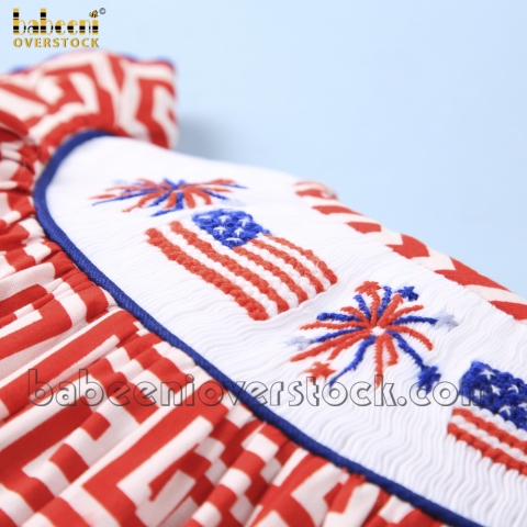 Feature:Adorable dress in bishop style with smocked patterns of the American flag and fireworks on the chest, angle-sleeves, back buttons, embellished with zigzag.