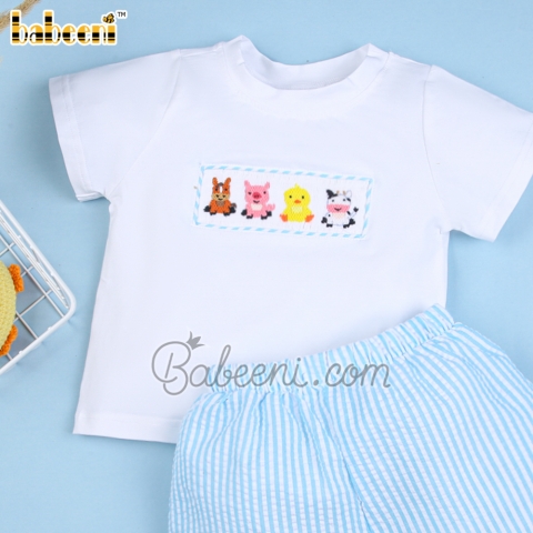 Feature: Nice clothing set for little boy with smocked animals on the chest. With perfect combination of white knit and aqua stripe fabric, the set is suitable for summer vacation.