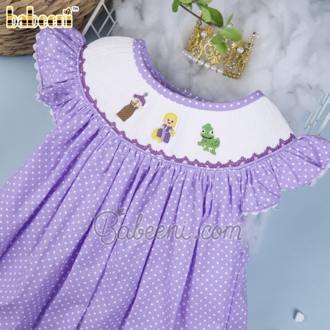 Feature:Beautiful bishop dress for little girl with smocked lighthouse, princess & frog on the chest, angel sleeves, white zigzag on sleeves & hem of dress. It is suitable for summer vacation.