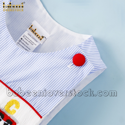 Feature:Cute baby boy romper with Alphabet train smocked pattern on the bodice, shoulder buttons, snap at crotch for easy dressing