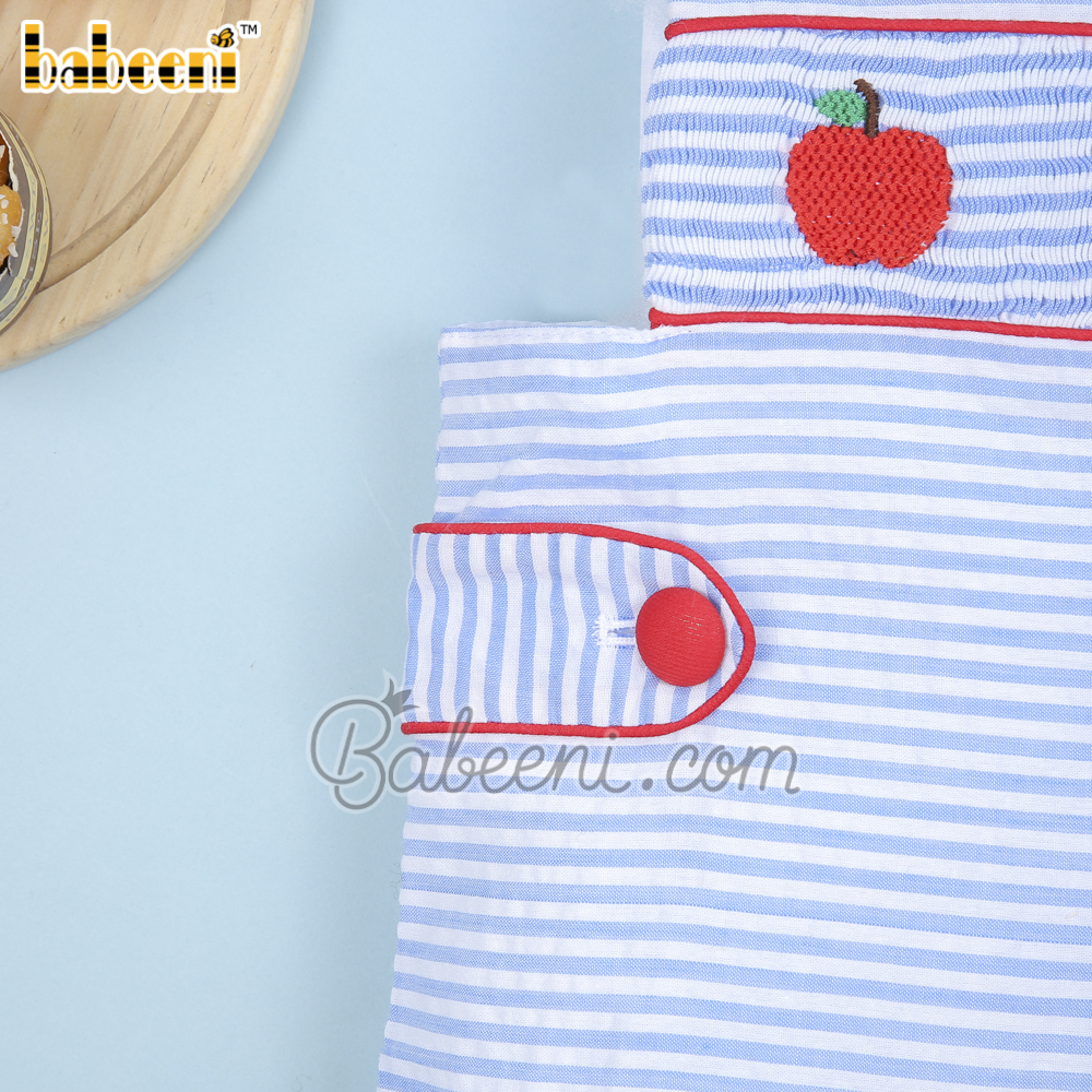 Feature: Cute smocked shortall for back to school occasion with apples smocked pattern on the bodice, side tabs, shoulder buttons, snap at crotch