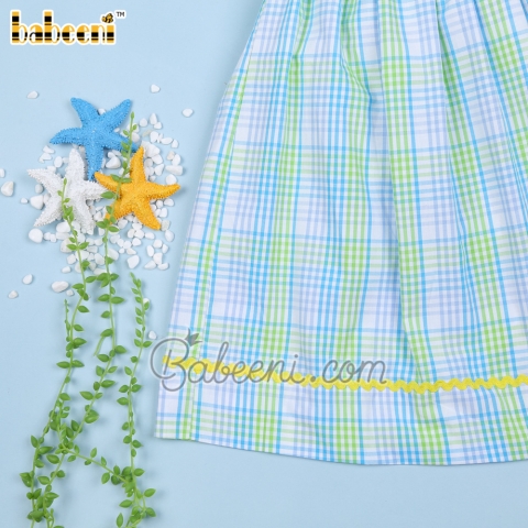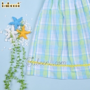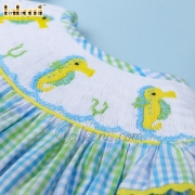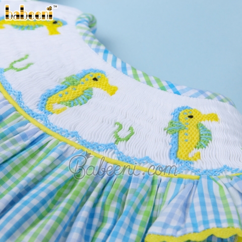 Feature: Beautiful smocked bishop dress for little girl with seahorse hand smocked patterns on the neck, short sleeves.
