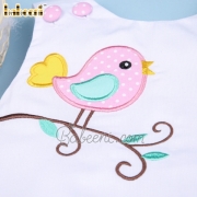 Feature: Nice sleeveless dress for little girl with bird applique pattern, shoulder buttons, lovely pink ribbon.