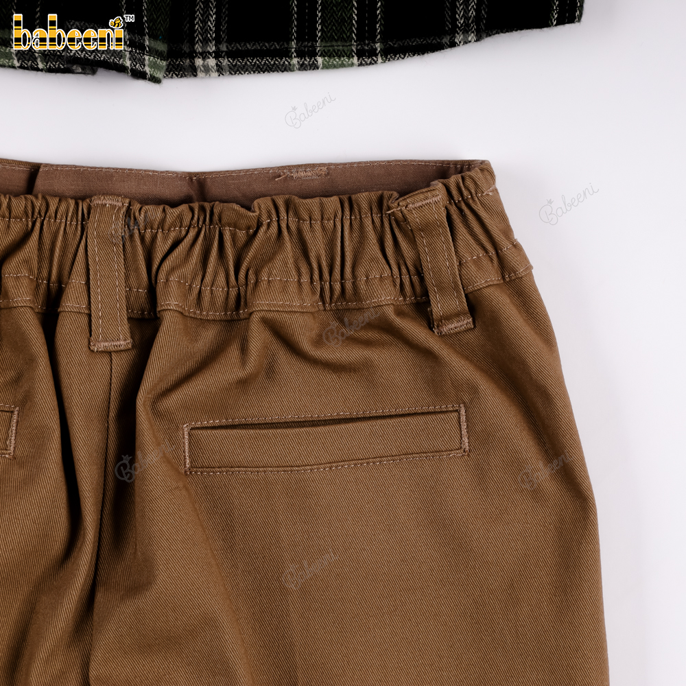 Boys' checkered flannel shirt in blue and black, and brown khaki shorts set.- BB3561