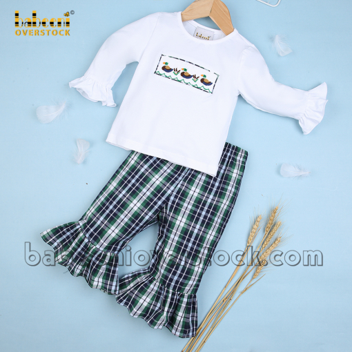 Feature:Pretty girl ruffle clothing with ducks and cattails pattern smocked on the chest. Plaid pant is designed in tone with the smocked pattern. This makes girl so cool.