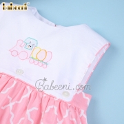 Feature: Lovely girl dress for Easter occasion with Bunny eggs train shadow embroidery pattern on large white rectangle bib, back buttons