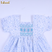 Geometric Smocked Dress Blue Flower On White For Girl - BB3286A