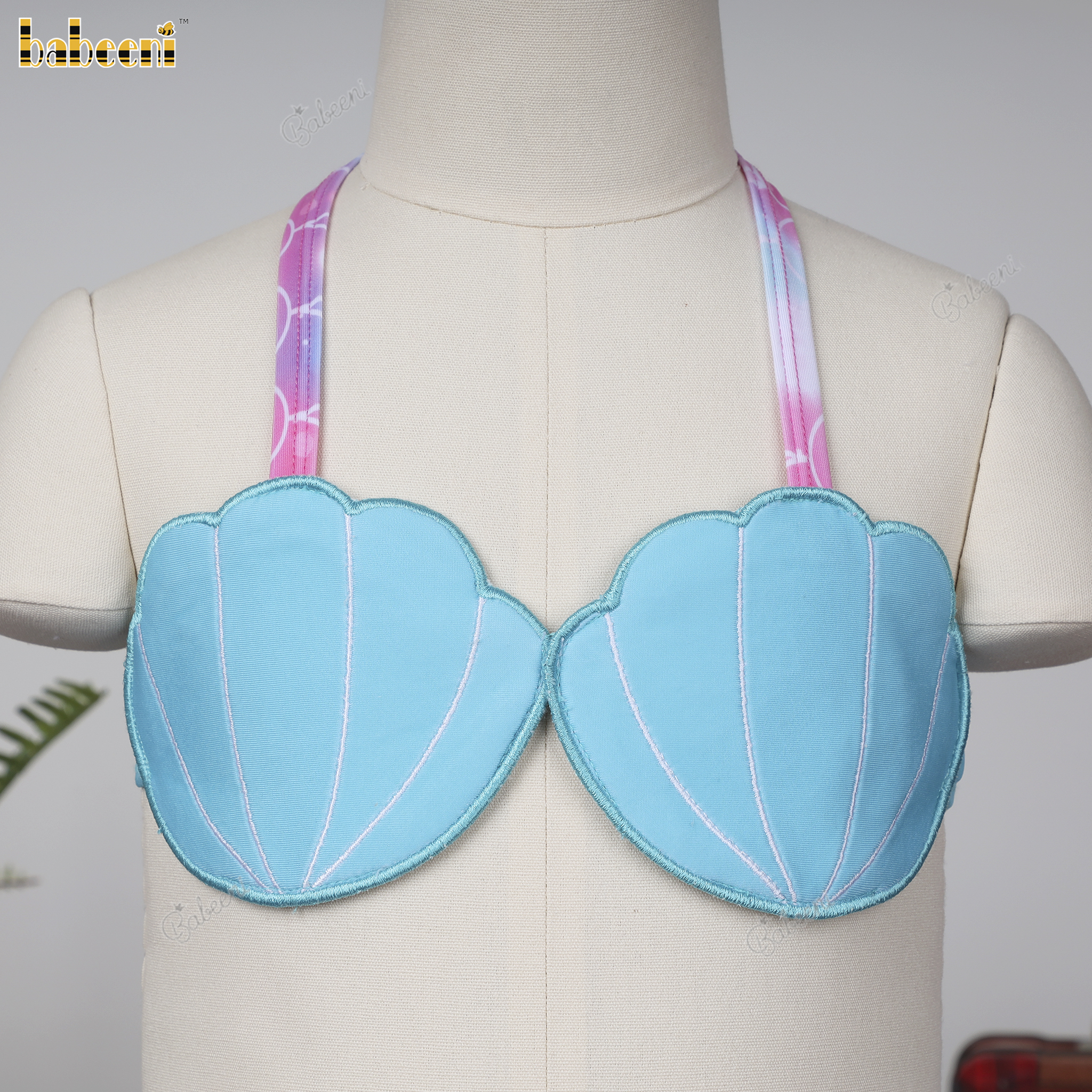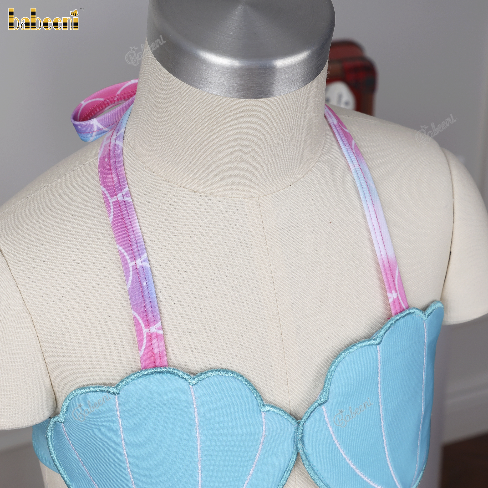 Feature: Cute two-piece bathing suit for girls with fish scales pattern, appliqued top.