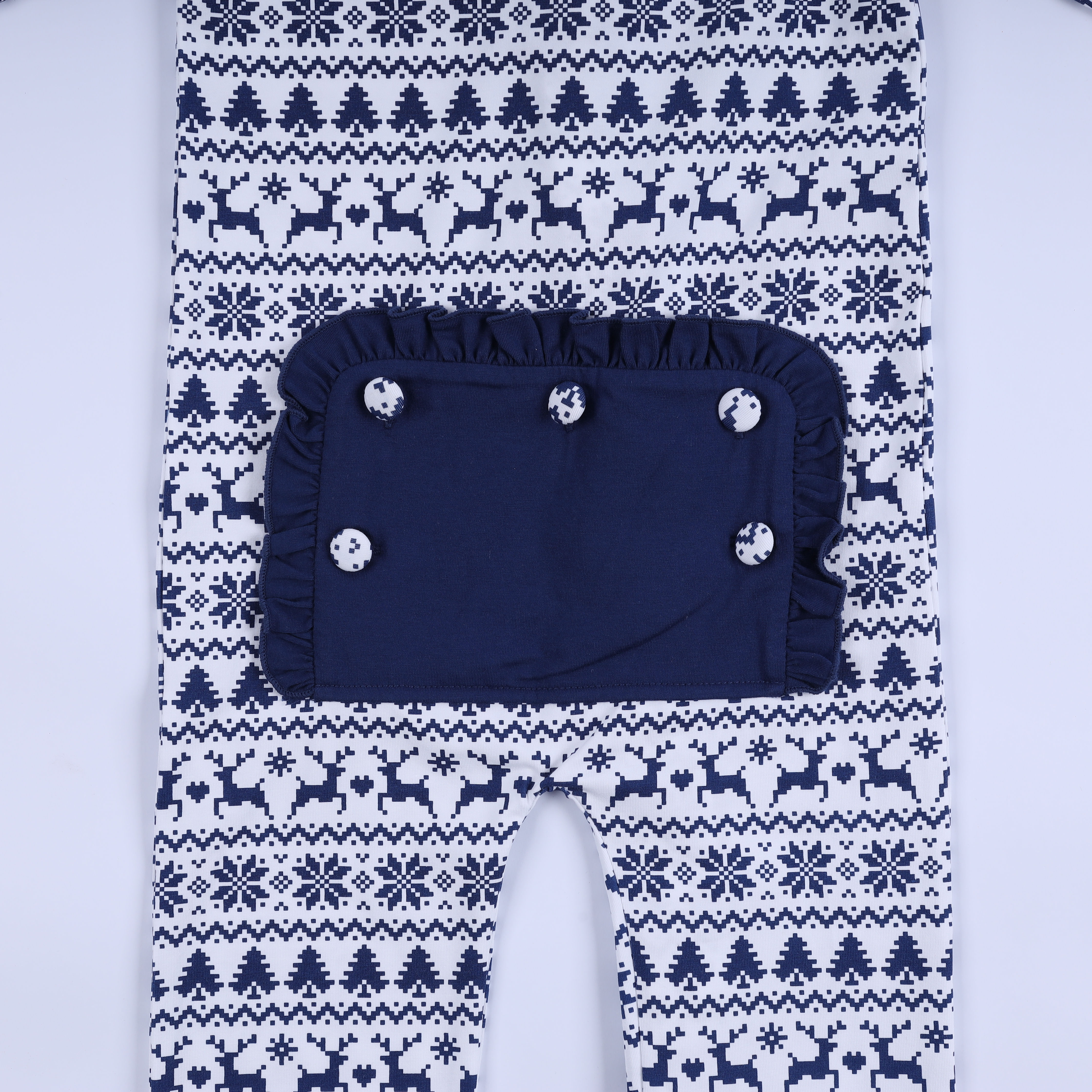 Features: This baby Christmas outfit features a classic Christmas motif with subtly repeating images of reindeer, Christmas trees, and snowflakes. The elegant charcoal purple and white color scheme creates a warm, sophisticated feel, perfect for winter. The long sleeves with ribbed collar, cuffs, and ankles provide excellent warmth, protecting your baby in cold weather. The dark blue back pocket adds a cute and practical touch. Suitable for everyday wear, outings, photoshoots, or Christmas celebrations.