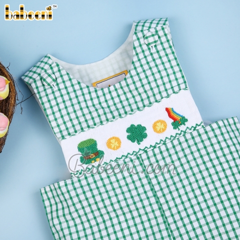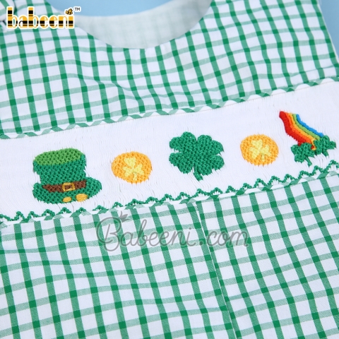 Feature: Lovely baby boy longall with St. Patrick day icons hand smocked pattern on the bodice, shoulder buttons, crotch snaps down to the stripe.