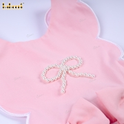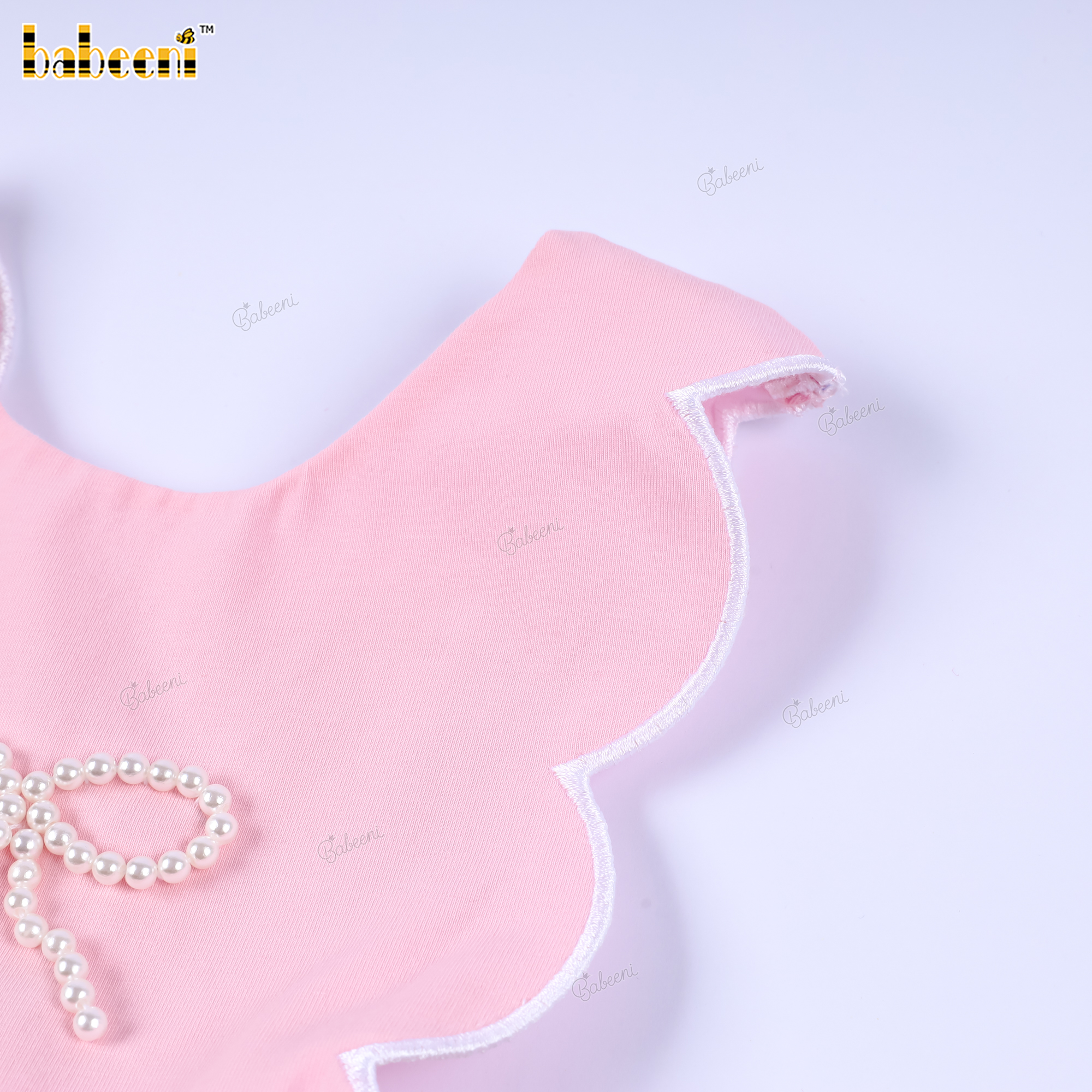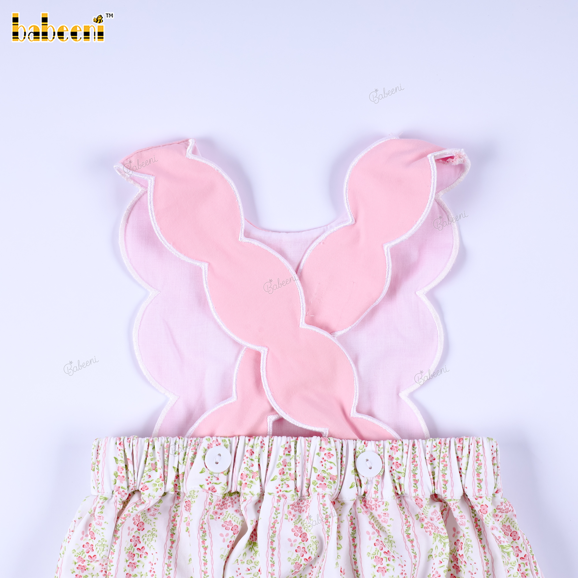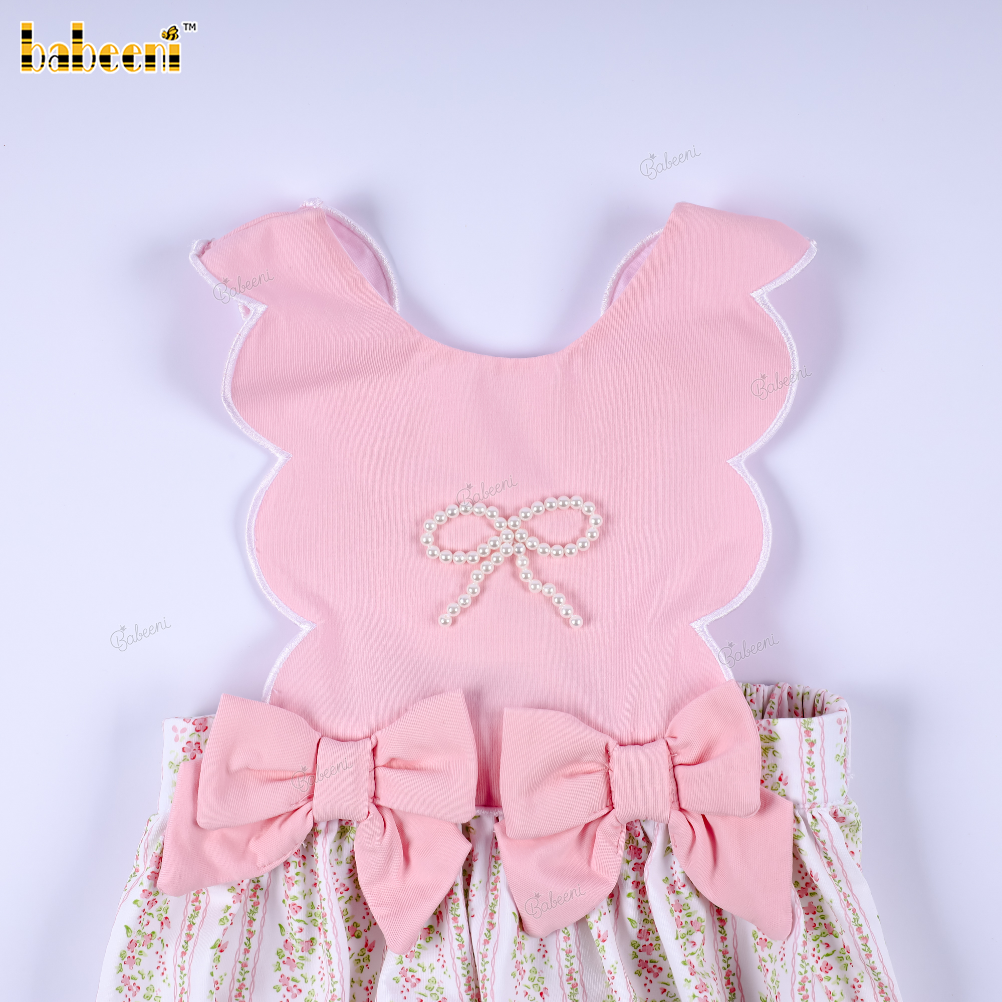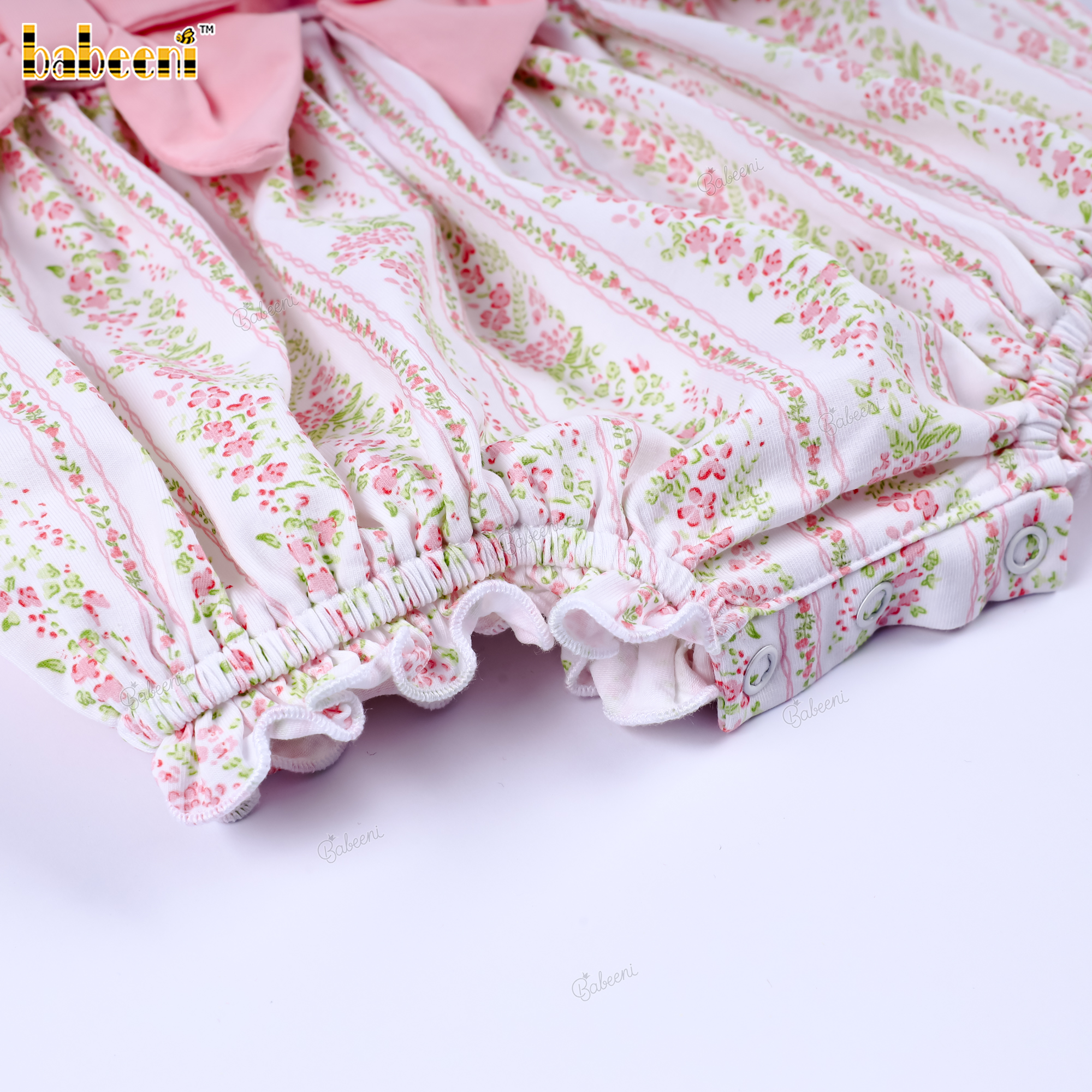 Feature: Adorable one-piece romper featuring a soft pink bodice with scalloped shoulder details and a delicate pearl bow embellishment on the chest. The bottom half showcases a floral striped bubble design with three matching pink bows at the waist. Elasticized leg openings provide comfort and easy movement for your little one. Perfect for casual outings or special occasions.