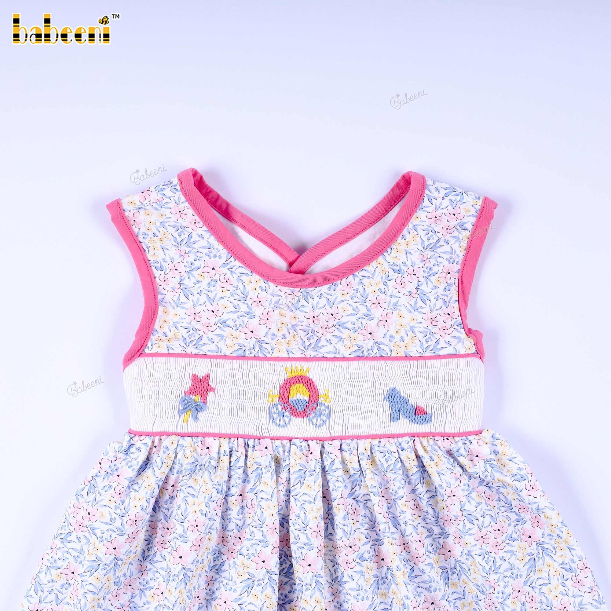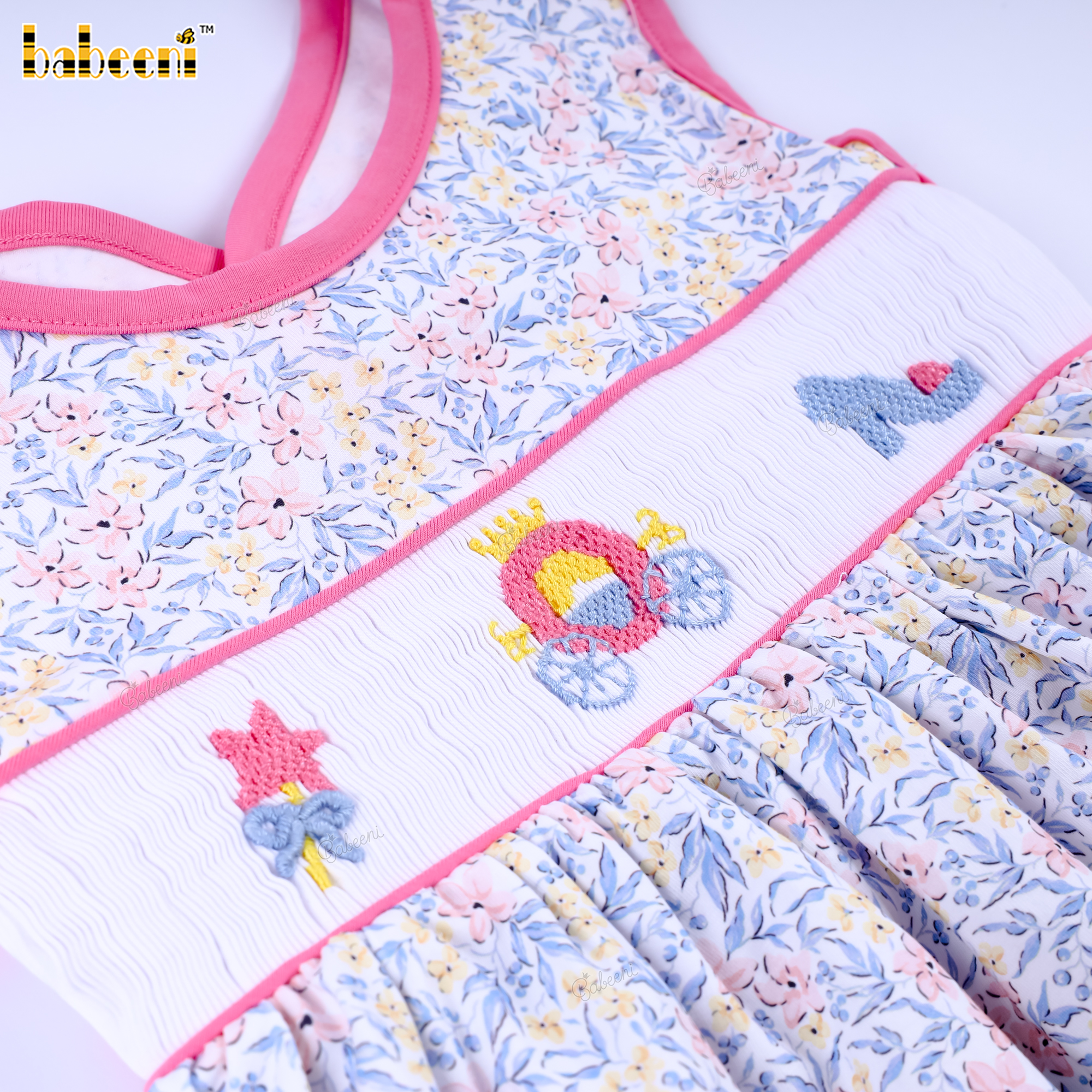 Feature: Adorable one-piece dress featuring a soft pastel floral print in light blue, pink, and yellow tones. The bodice is highlighted with delicate smocking and charming embroidered details, including a princess carriage, star, and playful motifs. Designed with sleeveless straps trimmed in bright pink and a cute cross-back style for added charm. The gathered skirt creates a light, flowy silhouette, making it perfect for summer outings, parties, or everyday wear.