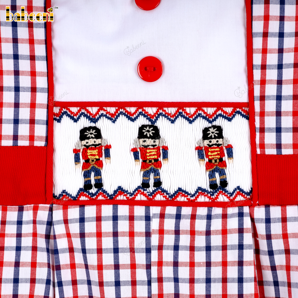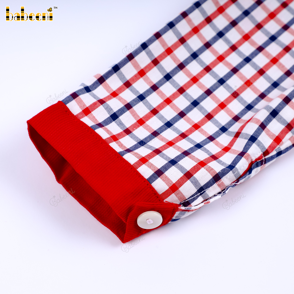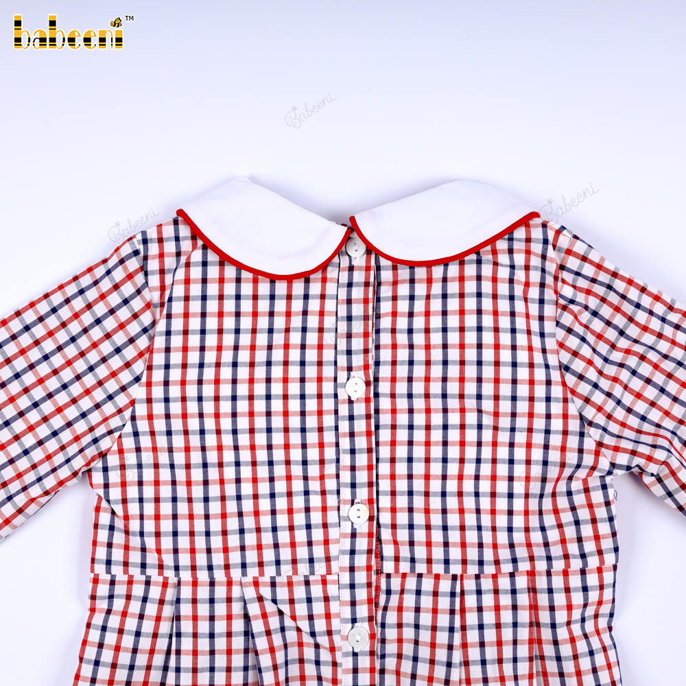 Features: Red and navy windowpane bubble for little boy with a rectangle hand smocked, long sleeves, peter pan collar. Perfect for Fall- Winter, Christmas. Best gifts for birthday or special days.
