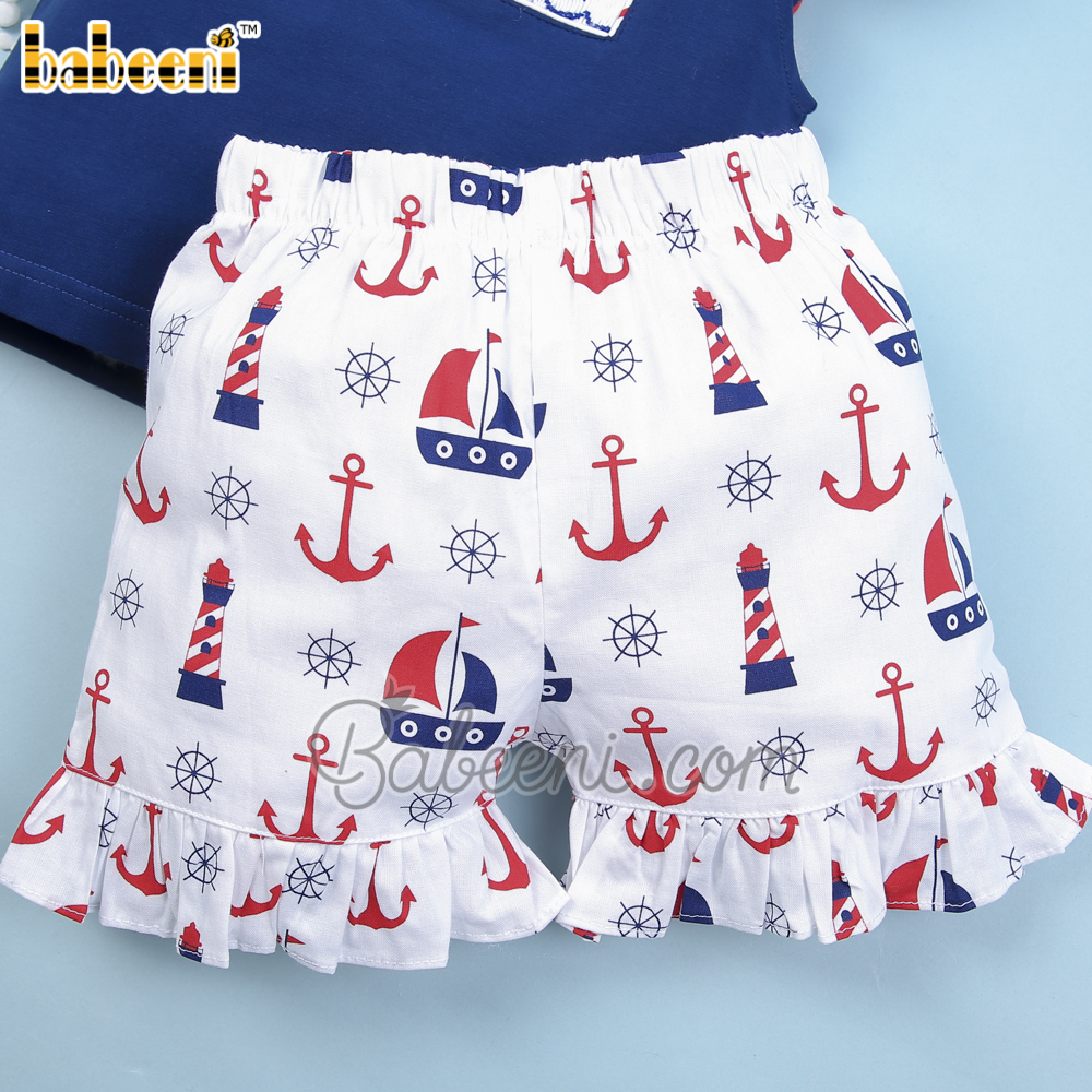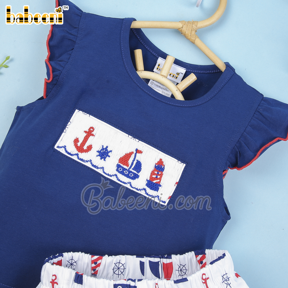 Feature:Nice outfit for little girl with sailboat, anchor, lighthouse and ship wheel hand smocked patterns, angel sleeves, round neck